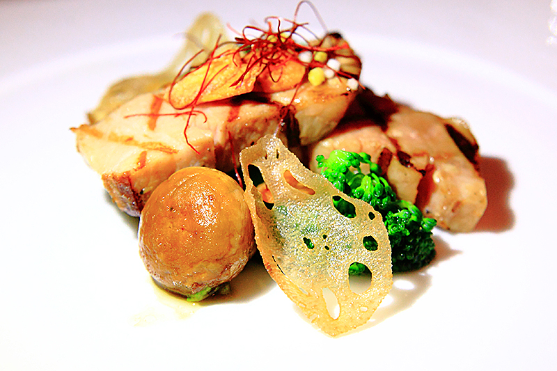 是用近期很夯的舒肥法,舒肥香料豬梅肉搭蒜味洋菇,洋菇煎的脆脆的,加上用舒肥機製作的香料豬梅肉,帶點熟嫩,炒蒜油烘烤的洋菇、青花菜、炸蒜片,宛如舌尖上跳舞。