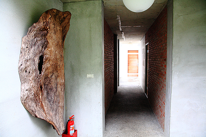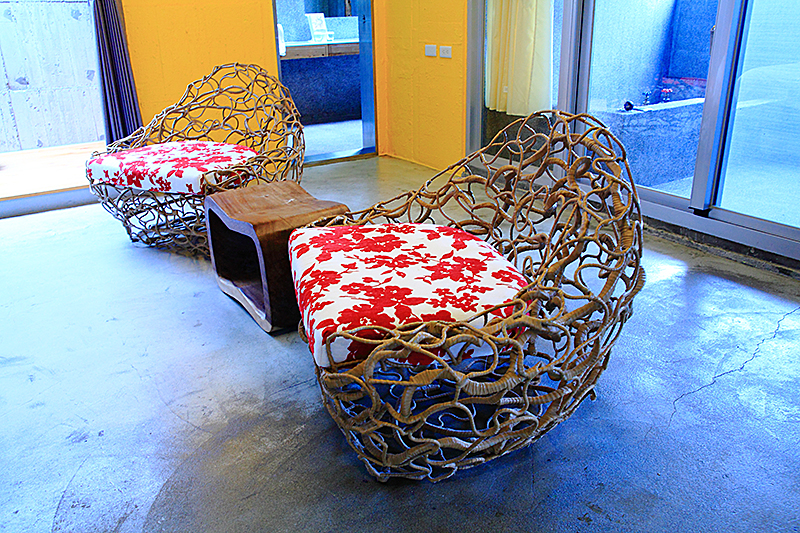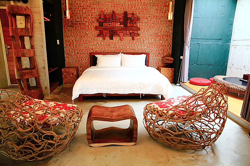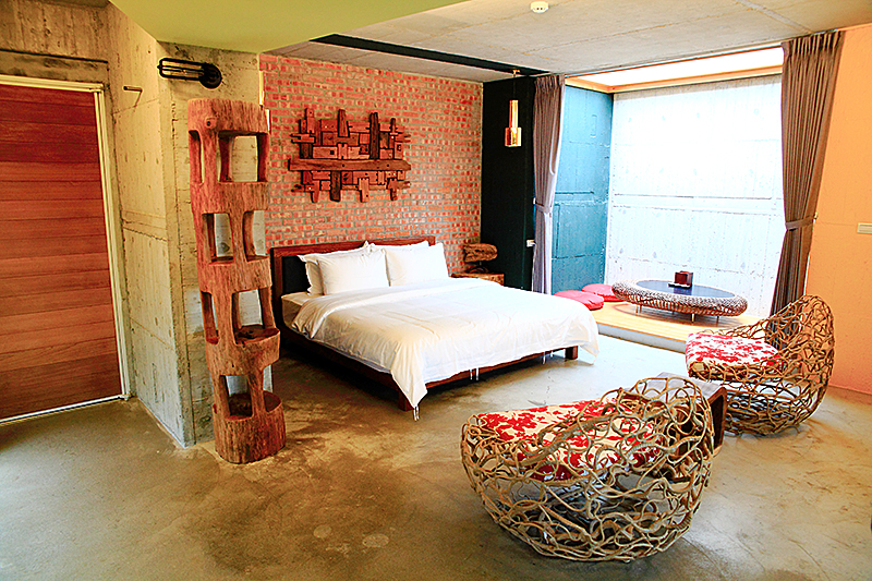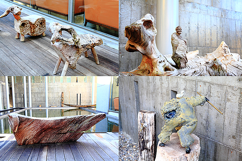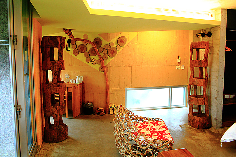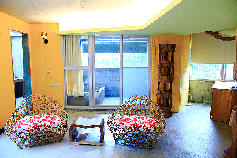 讓萍子佩服與喜愛是有朋會館Yu Peng Villa老闆的藝術涵養,很有品味,木頭都有其自然意境,檜木呈現,像是有羊造型的座椅、有孫悟空的木頭像、達摩神運氣息的木雕等,非常有意思,藝術品與清水模非常百搭。