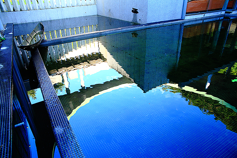 藍天倒映在池水中,倒影變化,漸層之美,非常夢幻。