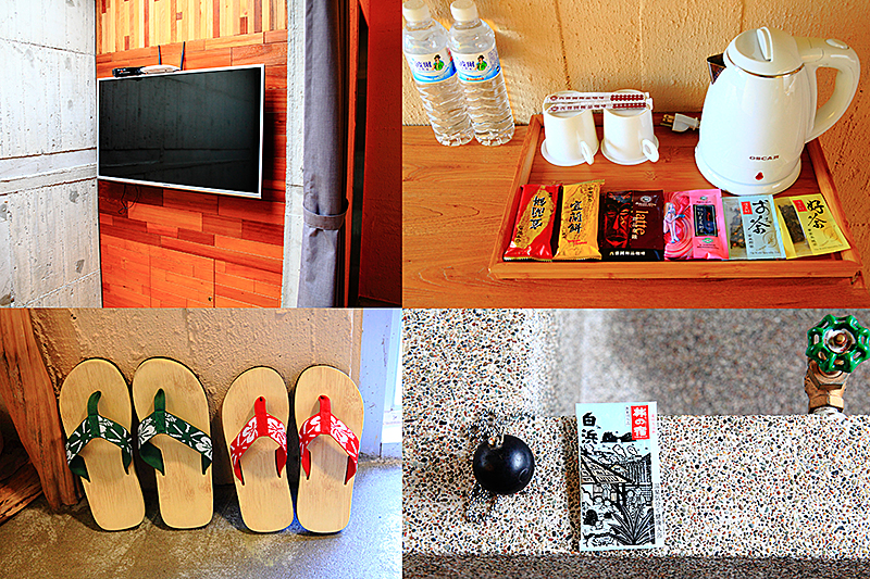 有朋會館Yu Peng Villa 提供夾腳拖鞋在室內可穿,讓腳可以好好放鬆,還有泡湯備品(溫泉粉),電視可觀看,收訊挺好的,還有宜蘭在地伴手禮「宜蘭餅」、免費茶包咖啡可喝。