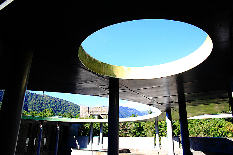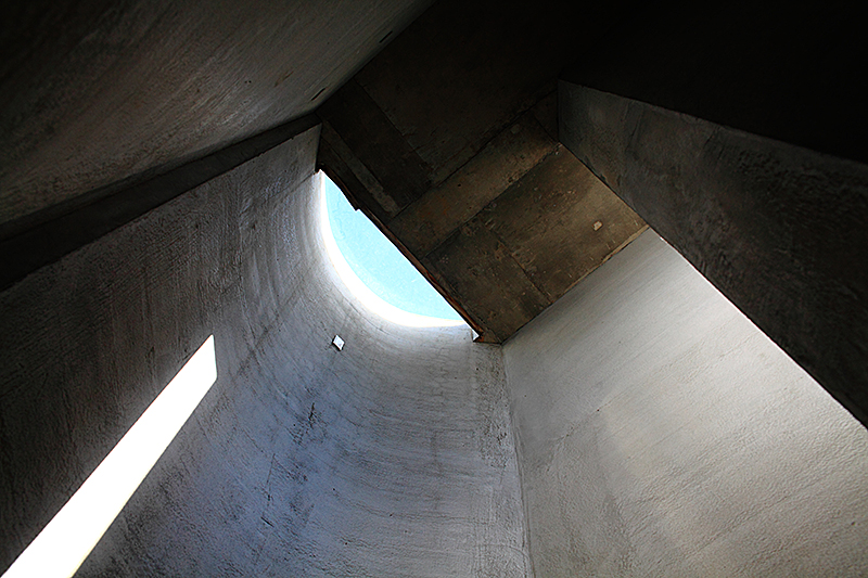 圓頂的裸空圓洞,藍天折射進入,整個水藍色。