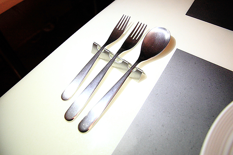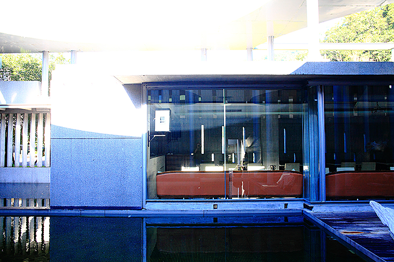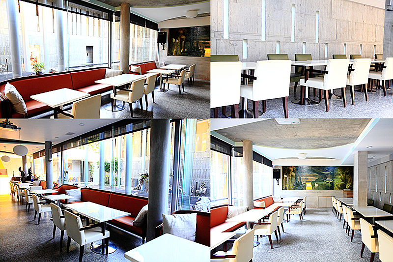 餐廳之間的中庭,天花板以鏤空設計,日光撒下,中庭水池畔旁,則是晚餐與早餐的用餐空間,整個餐廳圍繞著水池畔,景色怡然。