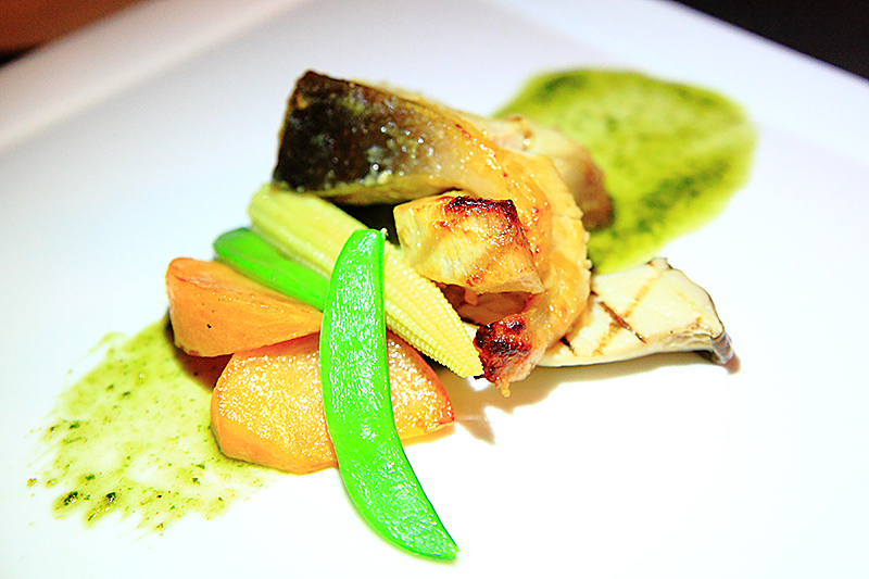 主菜:腐乳味噌烤鱘魚排,搭配荷蘭豆、玉米筍、紅蘿蔔煎過,逼出蔬菜香菜,切下鱘魚的魚排,肉質細緻,非常鮮嫩。