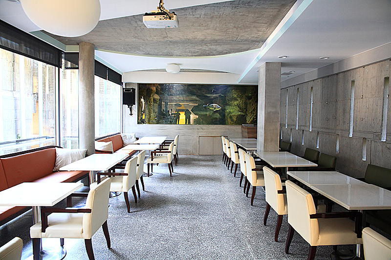 餐廳大面落地窗,站在湖水池畔旁,可窺探室內餐廳一景。