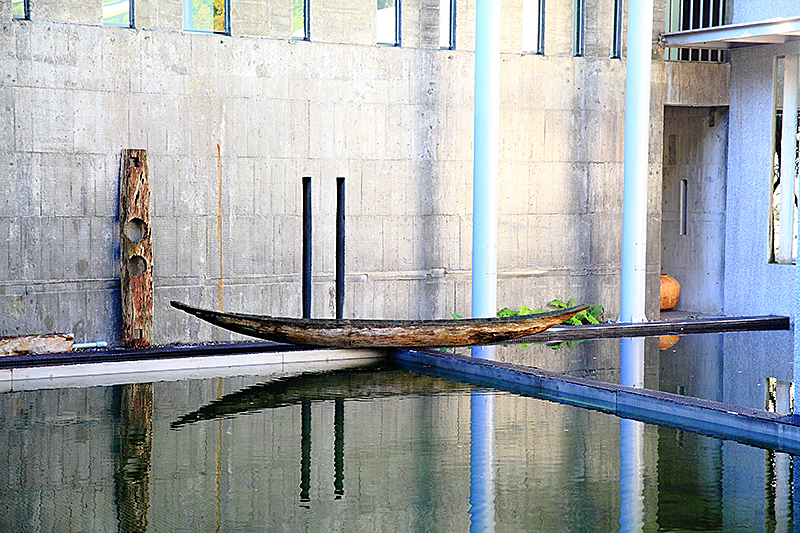 水池木舟,一整很有禪意,倒映在湖畔上。