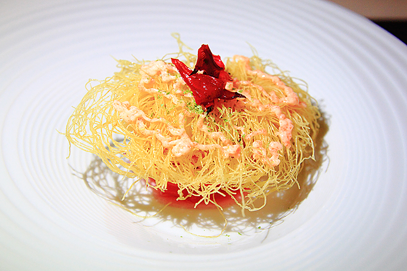 開胃菜:脆絲干貝搭梅汁蘿蔔佐明太子醬,宛如一個鳥巢的外觀,視覺很有賣點,很吸睛。