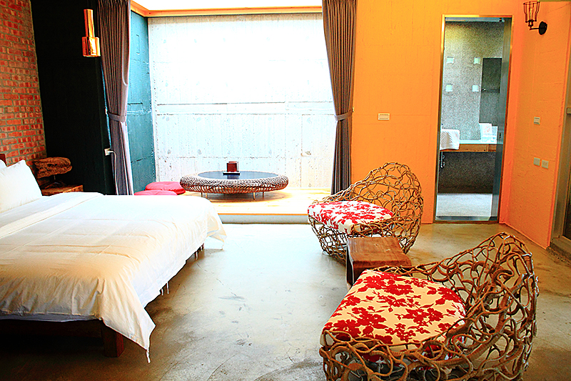 打開房型,很驚喜!一張雙人床面對遠方的山景,連房間都很寬敞,自然光折射進入室內,水泥灰色調地板,搭配編織椅、植栽,多了些禪意與設計感,萍子好喜歡。