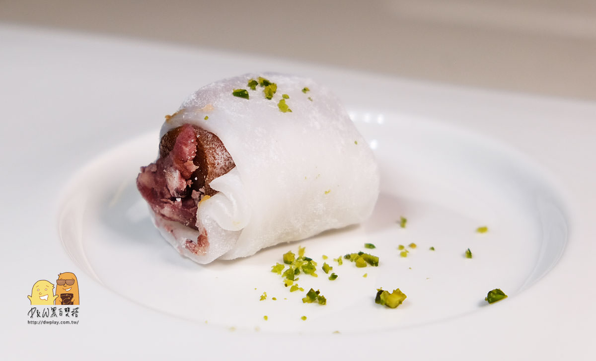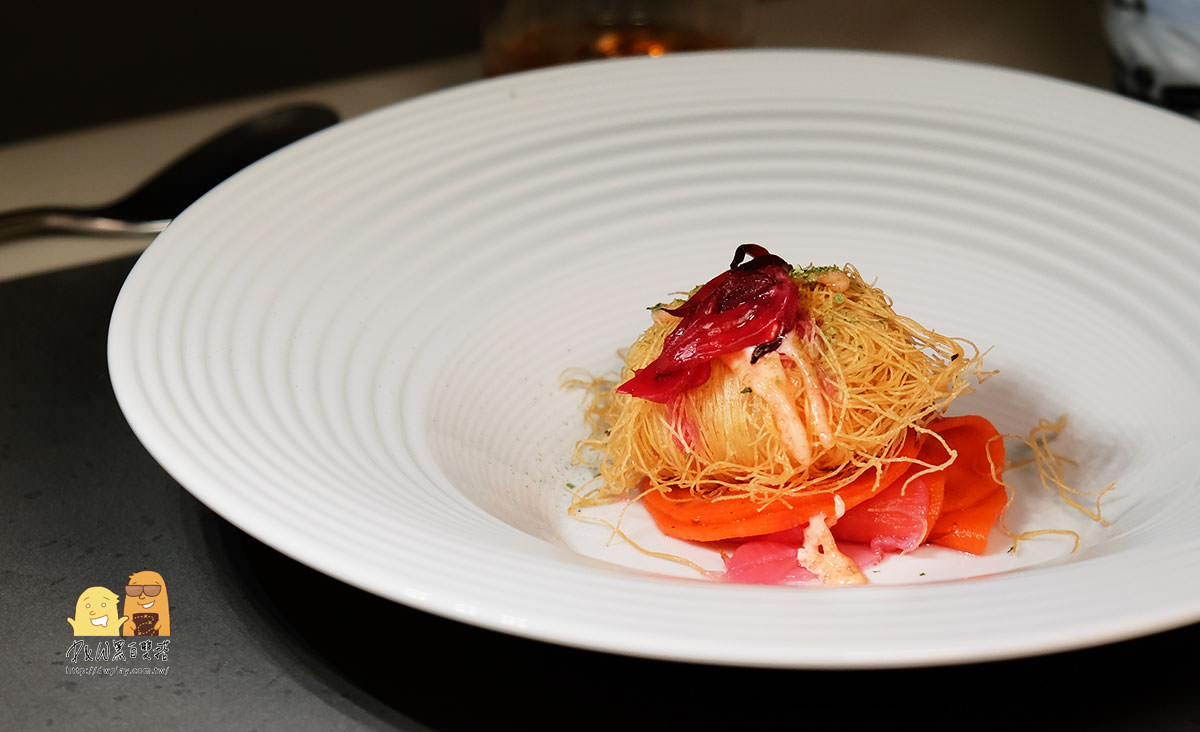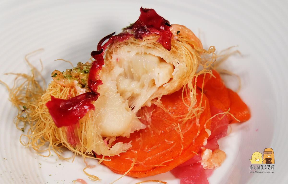 脆絲干貝搭梅汁蘿蔔佐明太子醬