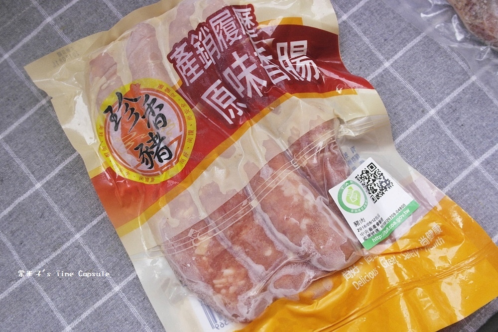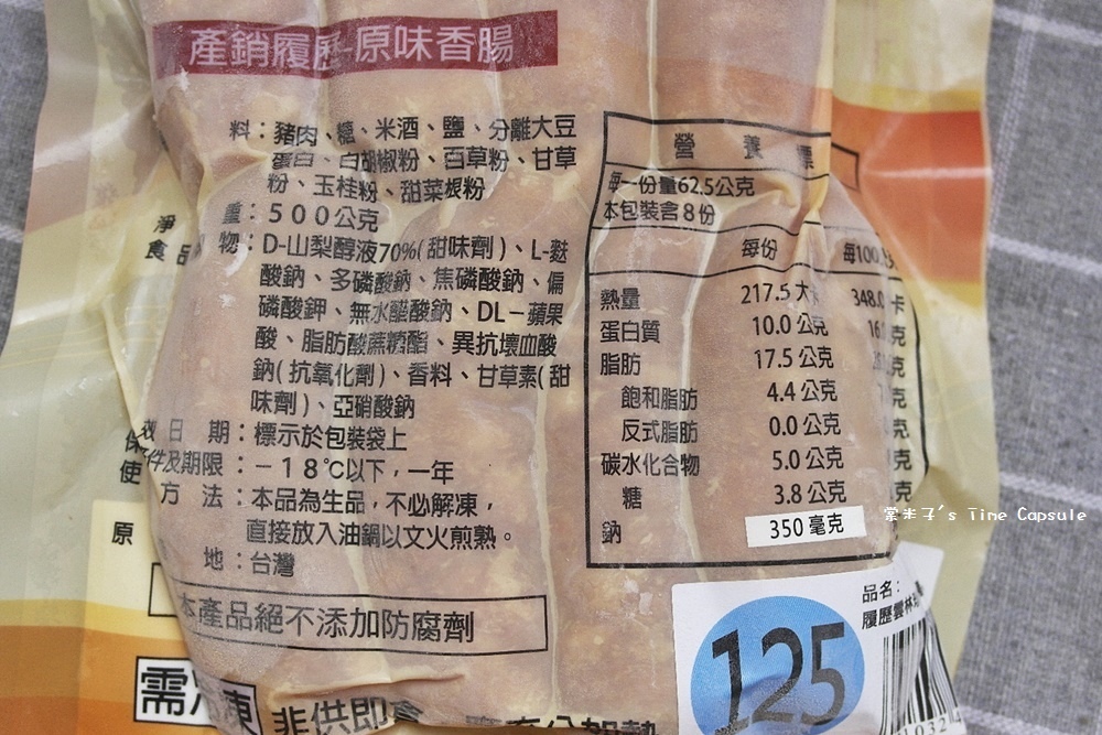 包裝袋背面清標示了原味香腸的成份、保存方法等,