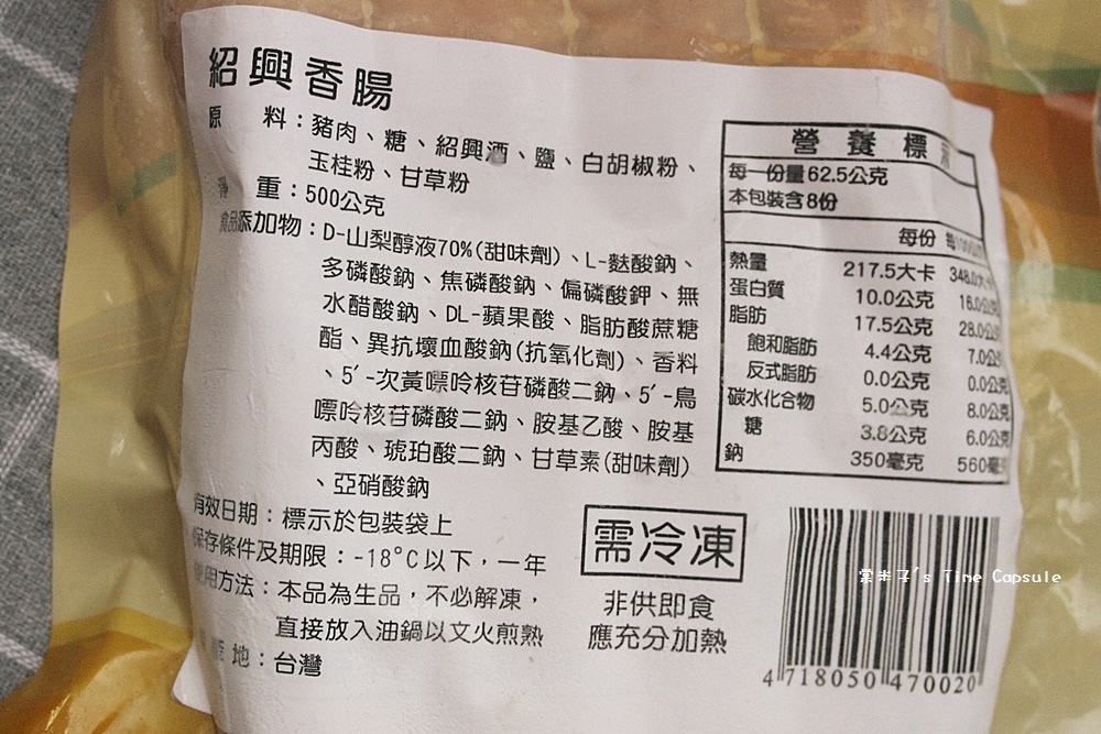 包裝背後是紹興酒香腸的製作原料,