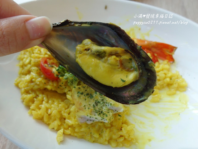淡菜也因為番紅花醬汁染成黃色,不過稍可惜的是淡菜有點太乾,海鮮腥味有點重