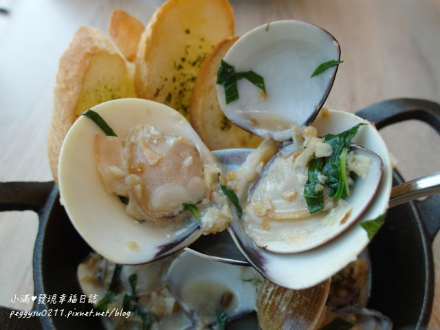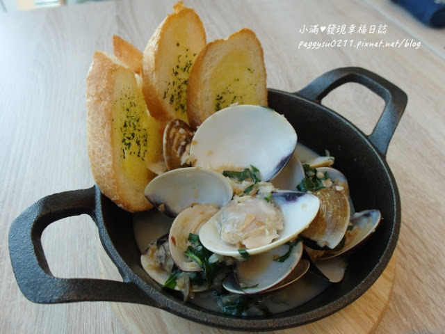 數十顆的蛤蜊加上蒜頭、九層塔、油蔥,以白葡萄酒烹煮