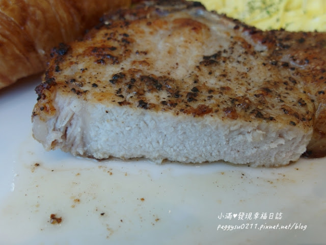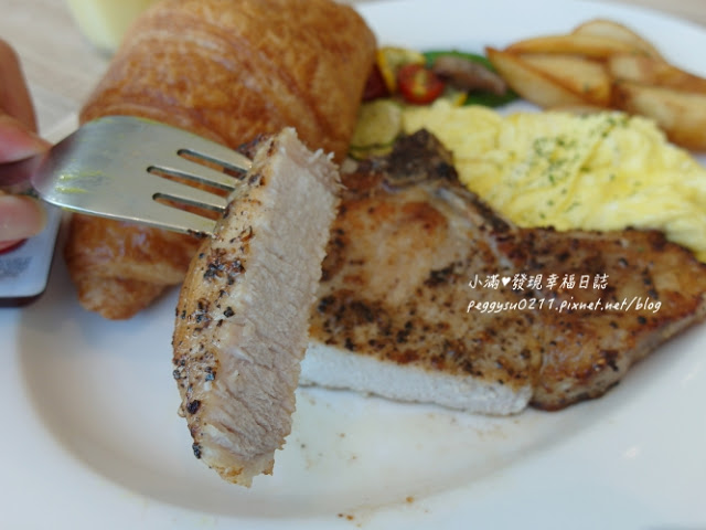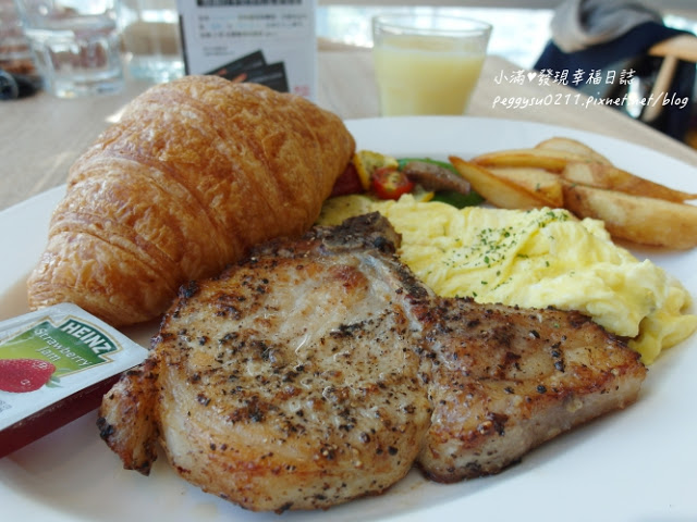 餐點一上桌時我們都超驚嘆,超大的可頌麵包、有超厚的黑豚豬排