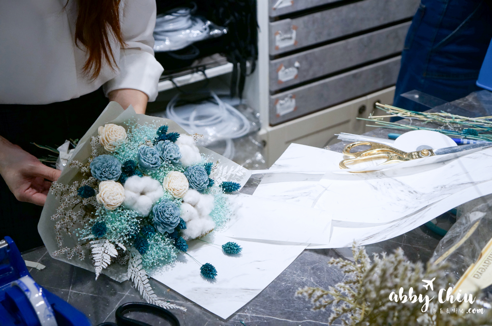 挑選了幾款藍色的花材以及我一直都覺得超可愛的棉花,搭配大理石紋的包裝紙以及白色的緞帶,接下來就交給花藝師大展巧手拉!