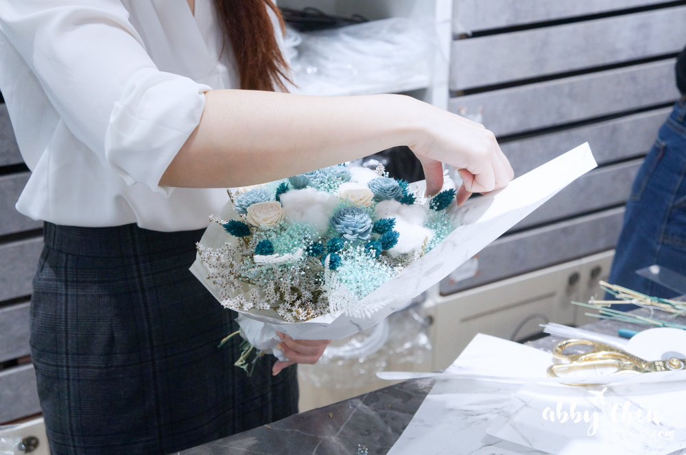 等了大約半小時,我的花束終於完成了,花藝師還幫我加了一些雪花跟特殊的葉子,看起來又更豐富了,一完成我立刻拍照傳給身邊的朋友看,大家都說超級夢幻阿 !