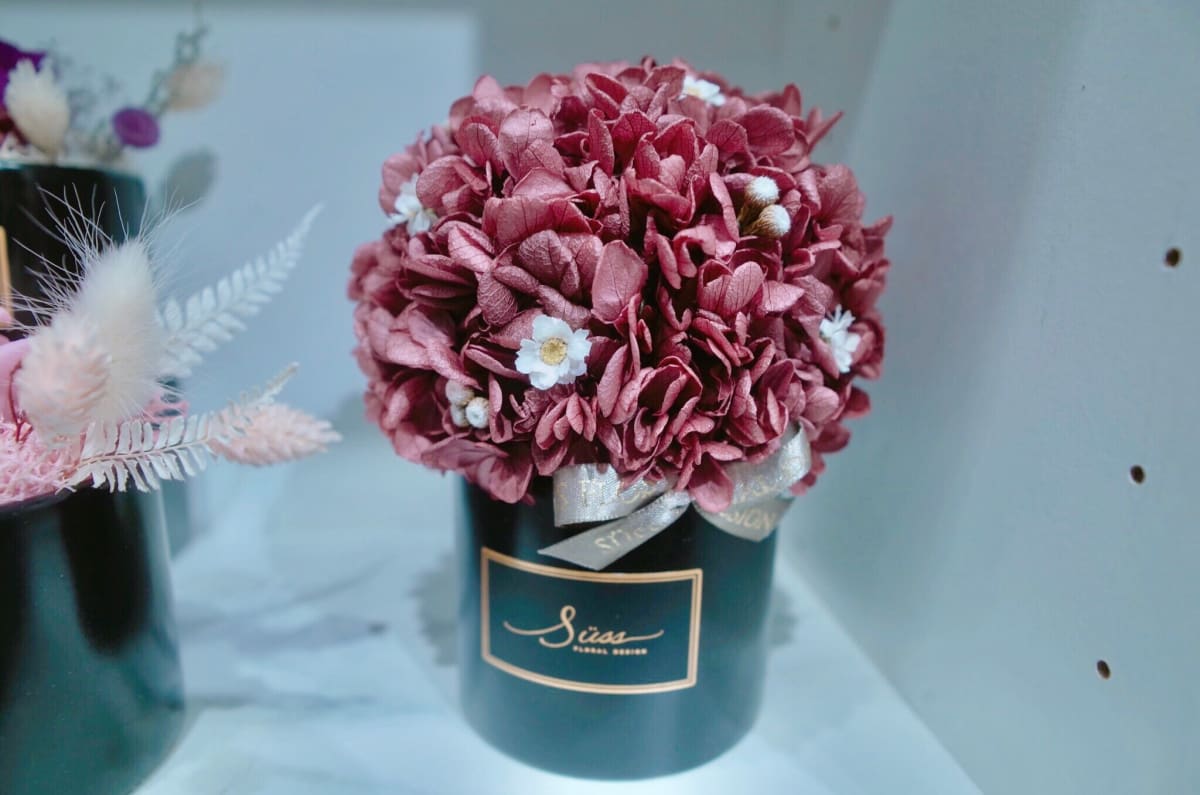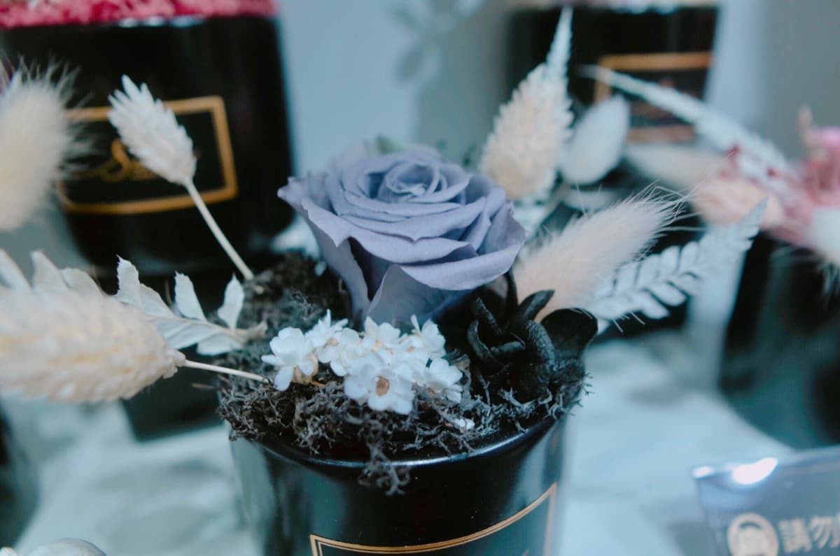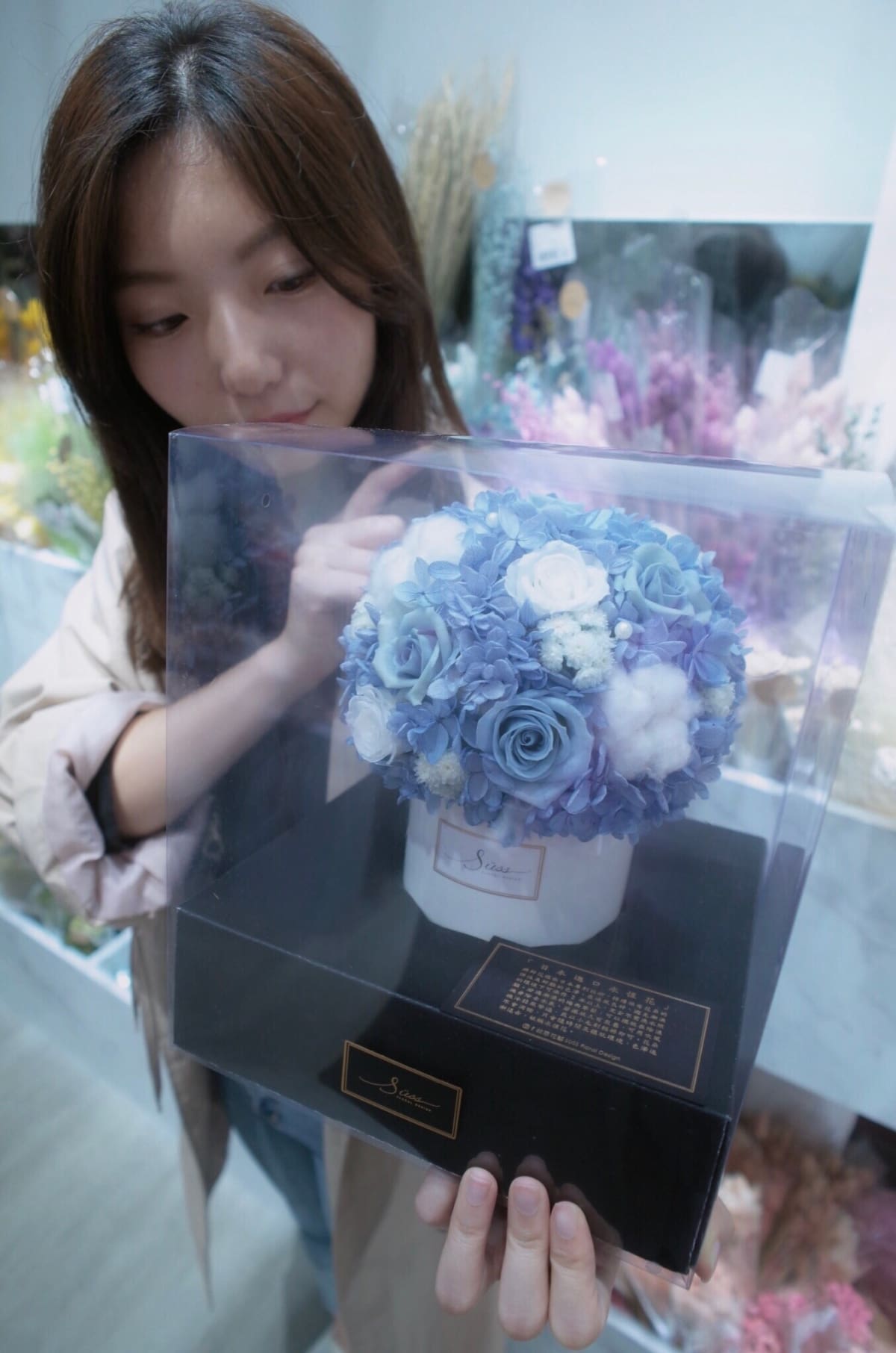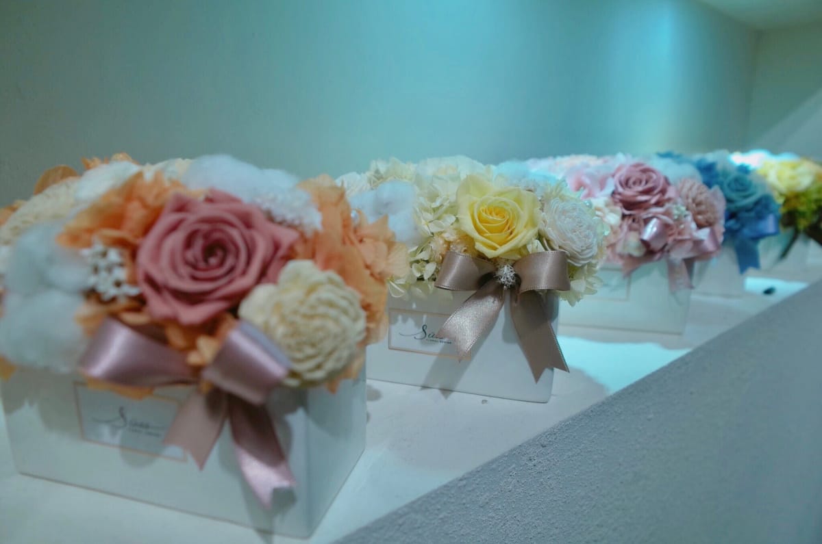 敘思花藝是採用品質最好的日本永生花,只能大概知道是以特殊細胞作處理,詳細的製作方式其實不是很清楚,但材質與乾燥花是可以很清楚的區分的,像是,以滿天星來說,滿天星永生花就會有彈性,大約可以保存兩年以上;滿天星的乾燥花就會隨著時間變色,等變成褐色後,就會開始脆化,時間一久,只要一碰到它,花體就會整個散落。