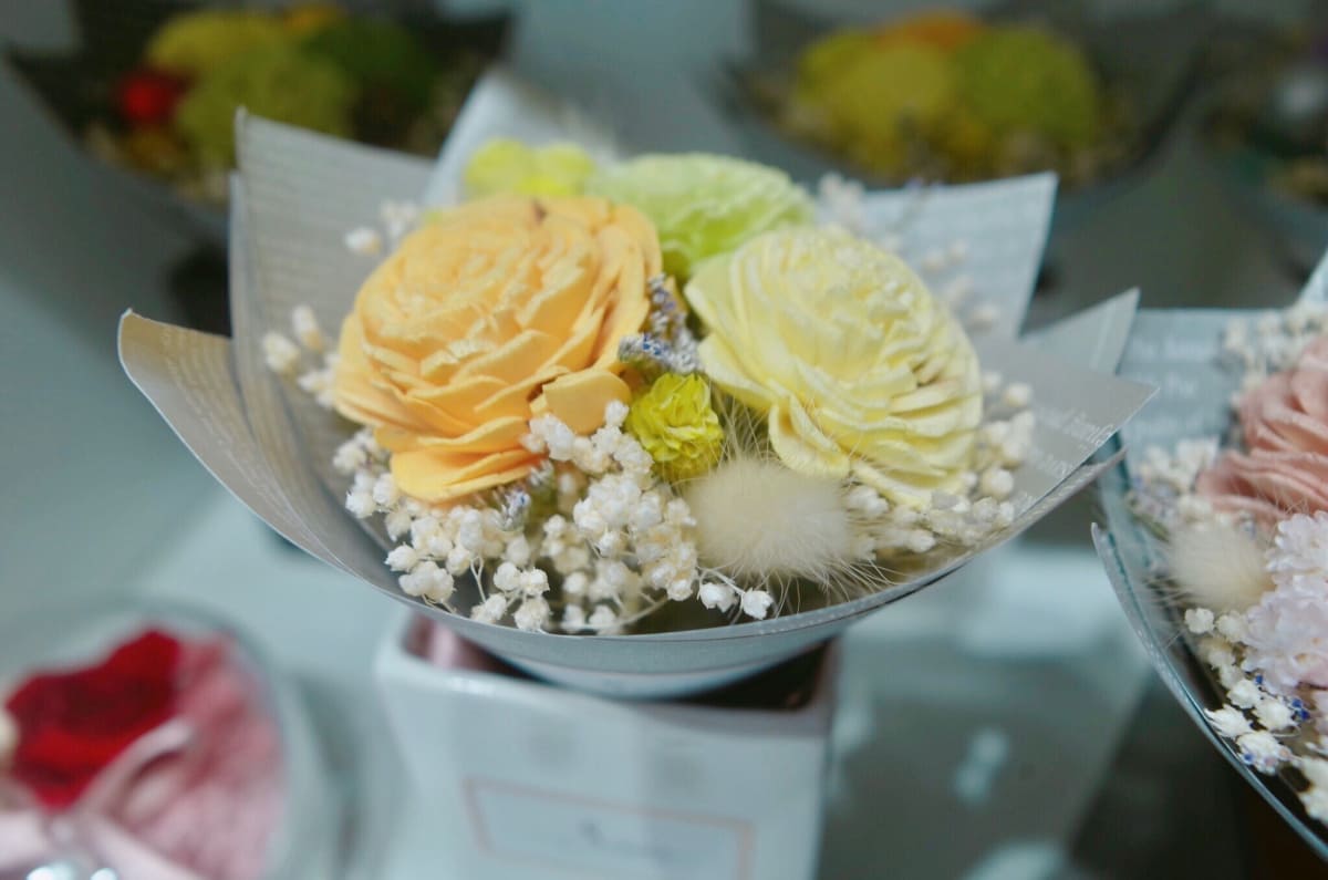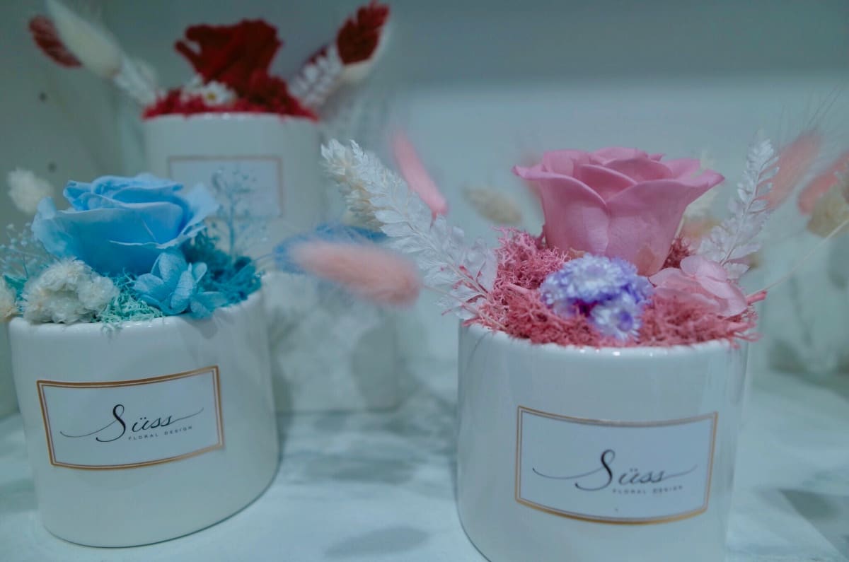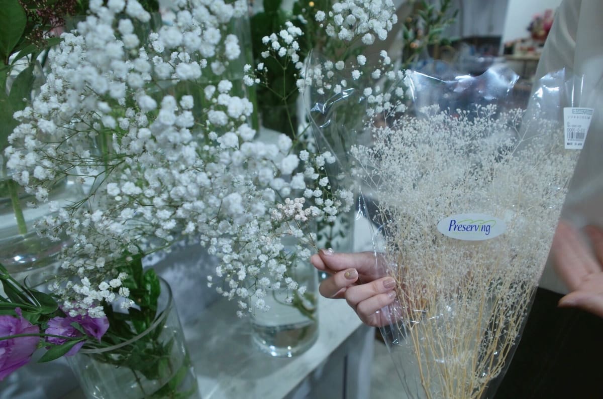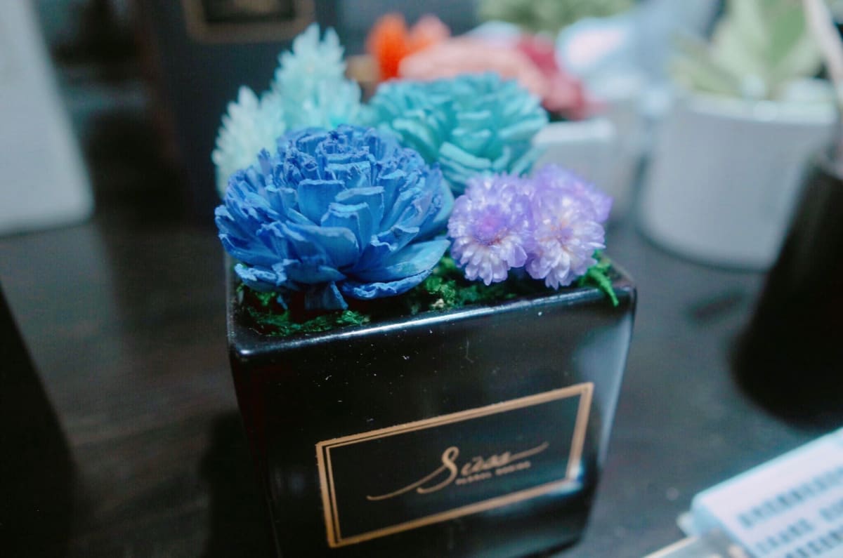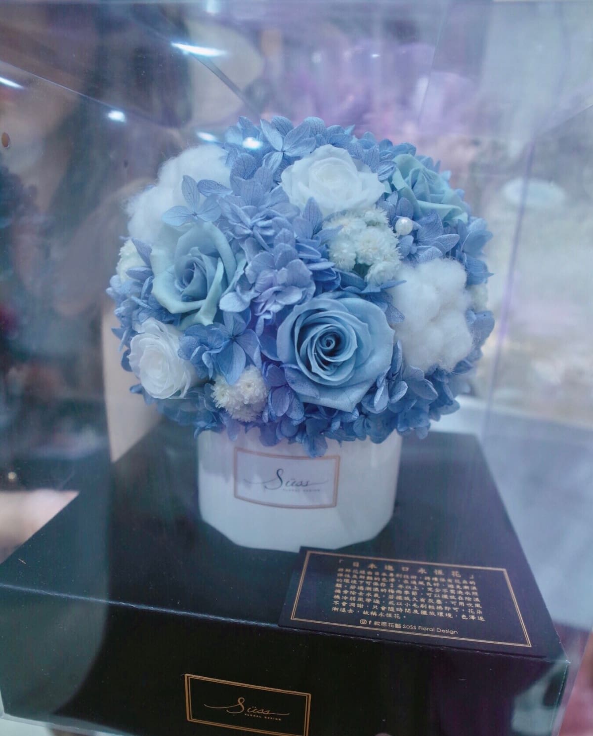 敘思花藝是採用品質最好的日本永生花,只能大概知道是以特殊細胞作處理,詳細的製作方式其實不是很清楚,但材質與乾燥花是可以很清楚的區分的,像是,以滿天星來說,滿天星永生花就會有彈性,大約可以保存兩年以上;滿天星的乾燥花就會隨著時間變色,等變成褐色後,就會開始脆化,時間一久,只要一碰到它,花體就會整個散落。