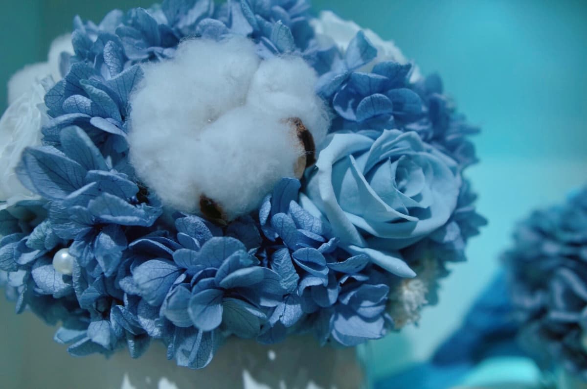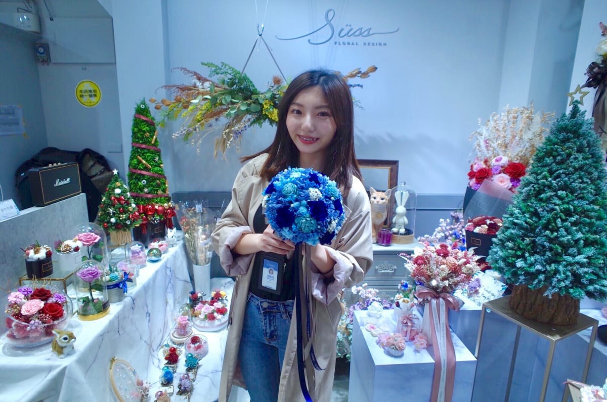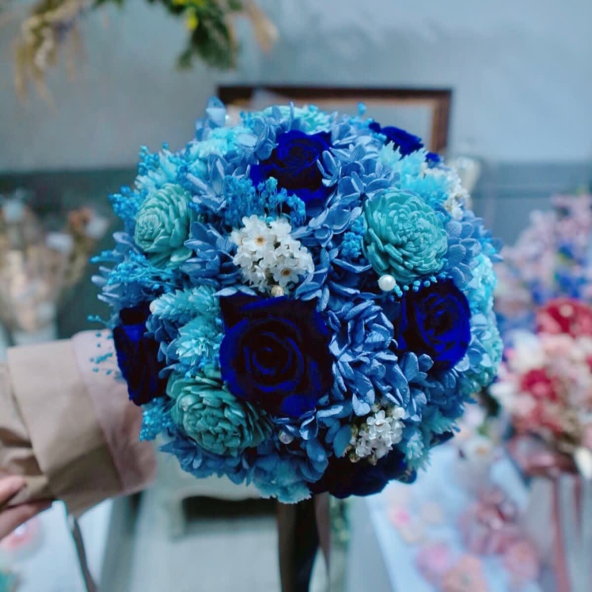 這束其實是客人訂製的捧花,他們想去國外辦婚禮,特別與設計師討論他們想要以藍色為主的捧花
