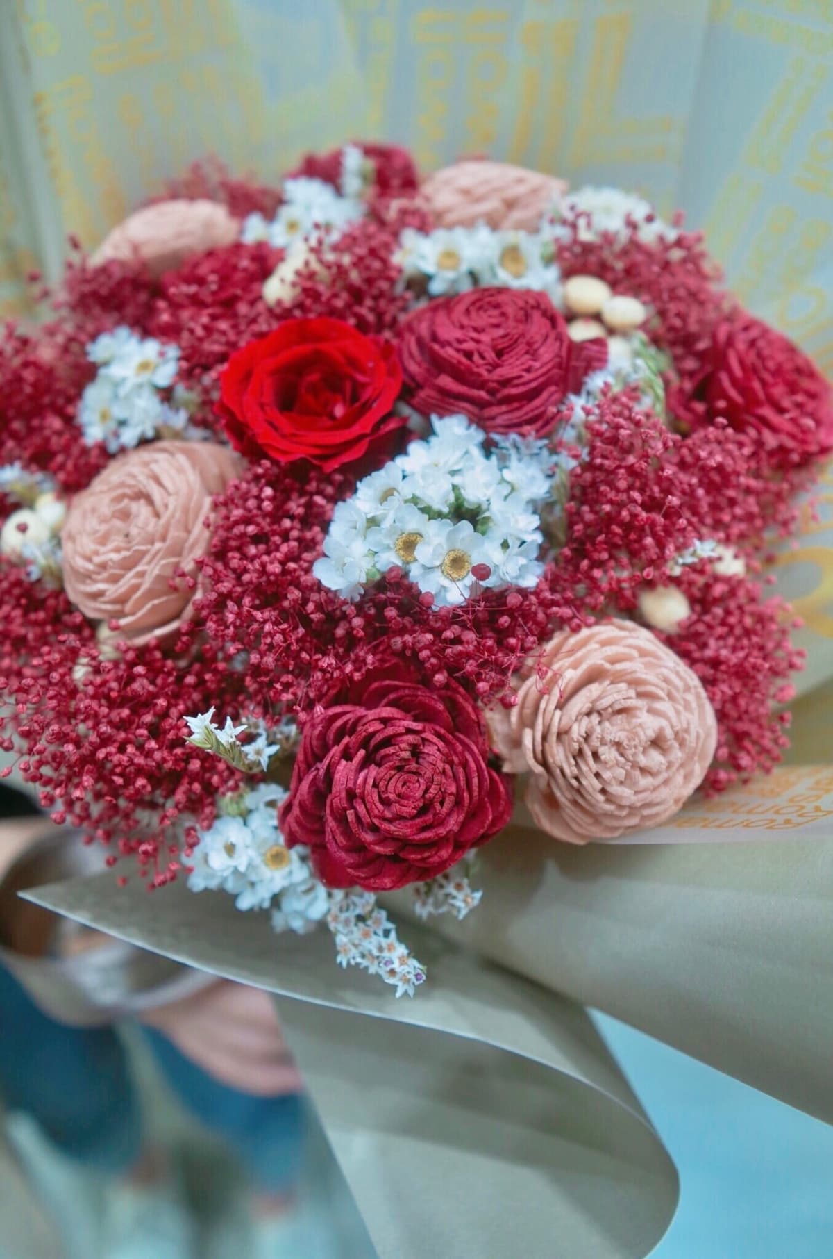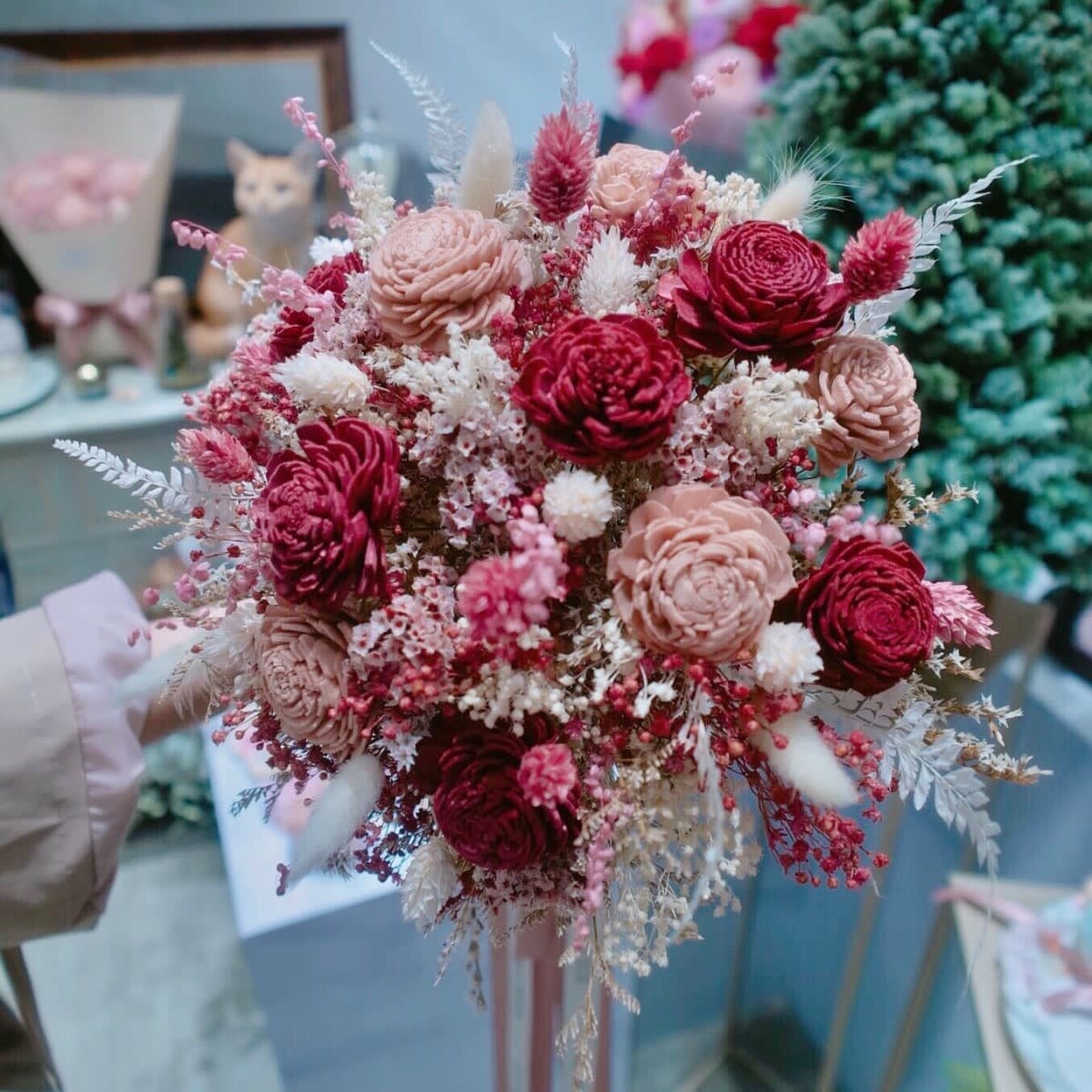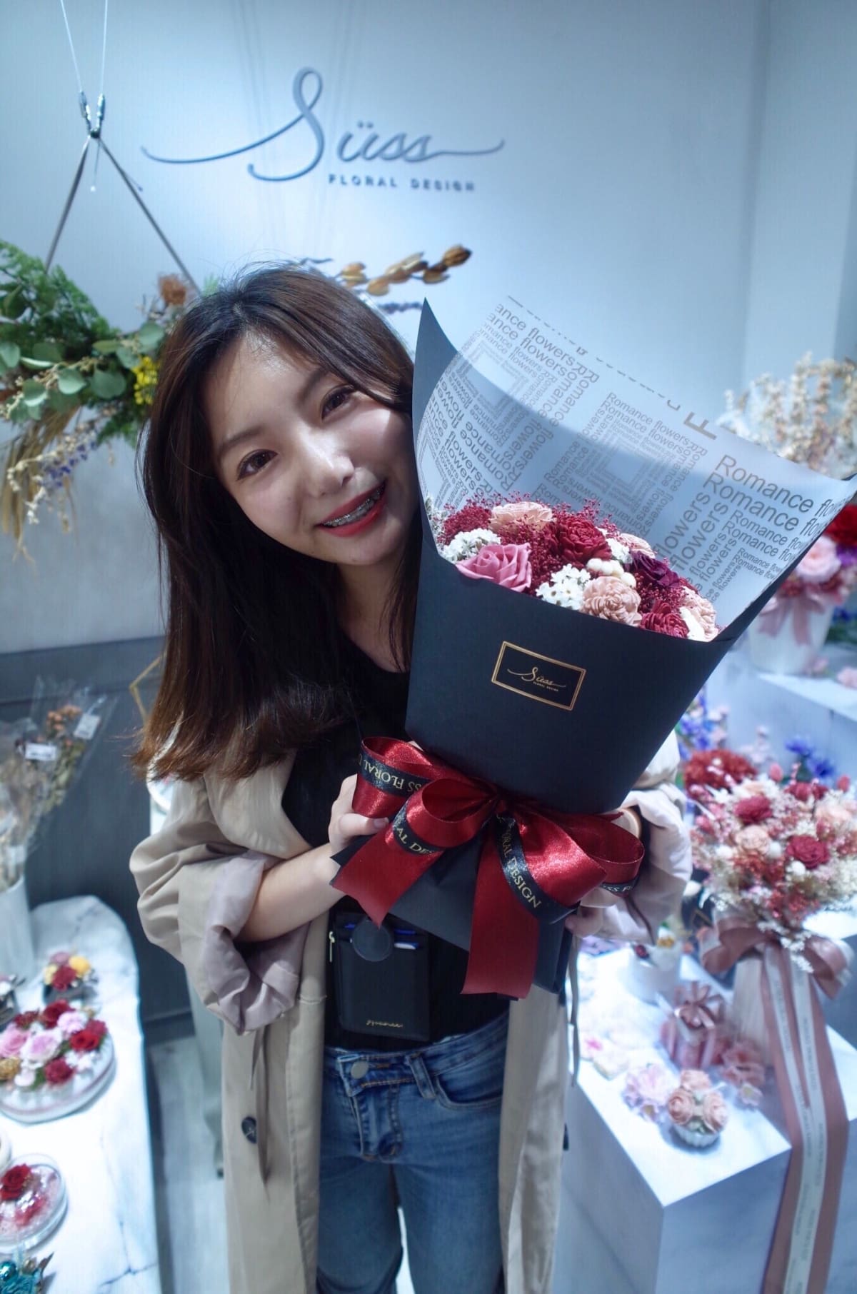 花束的部分是可以現場挑選的,製作時間就是半小時至一小時,若時間很趕的話,建議前兩天先至店面預訂,預訂也是有好處的,可以先挑選自己喜愛的花與顏色搭配,店家會先幫你做預留,這樣自己喜愛的花朵就不會挑不到啦!