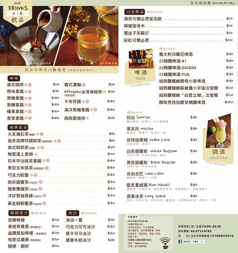 除了果汁、茶類、冰沙、咖啡,還提供啤酒(喝酒不開車,飲酒過量、有礙健康~)