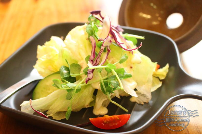 有美生菜、紫萵苣、豆苗、蕃茄、酸甜沙拉醬…