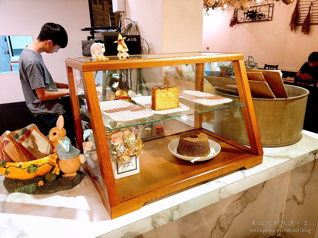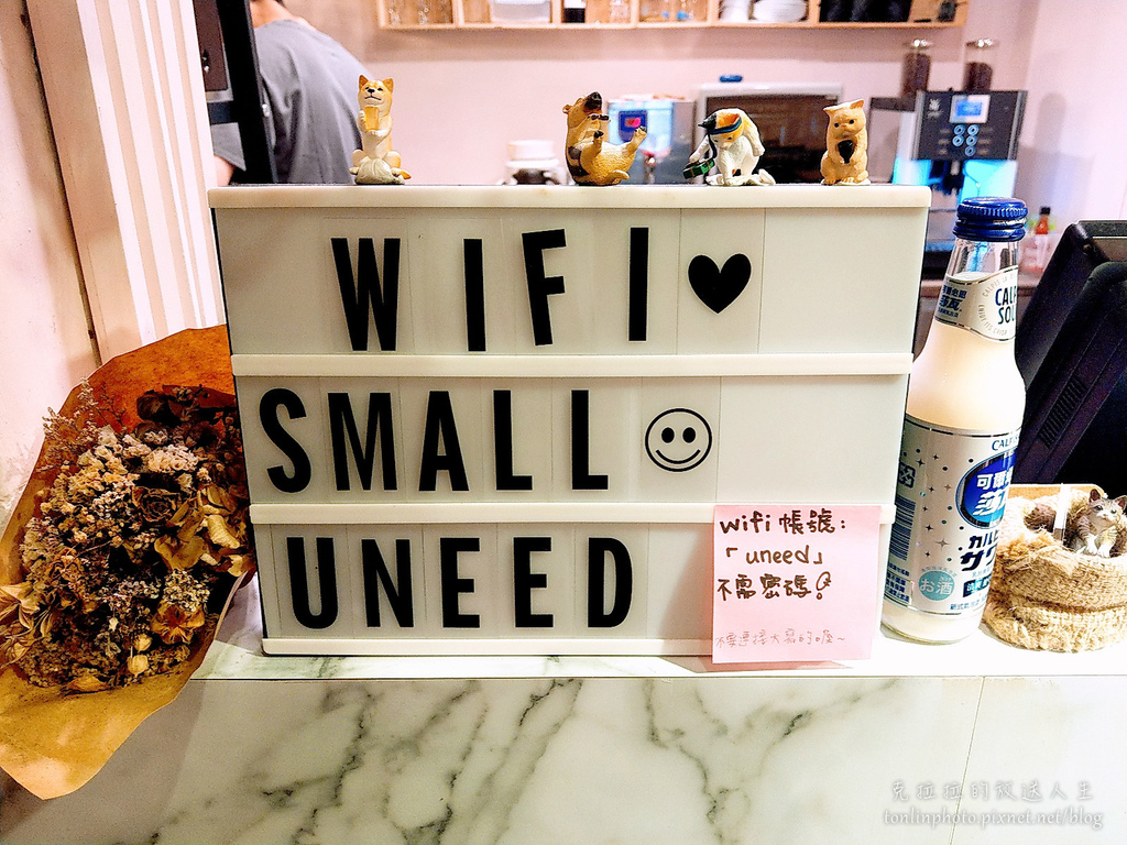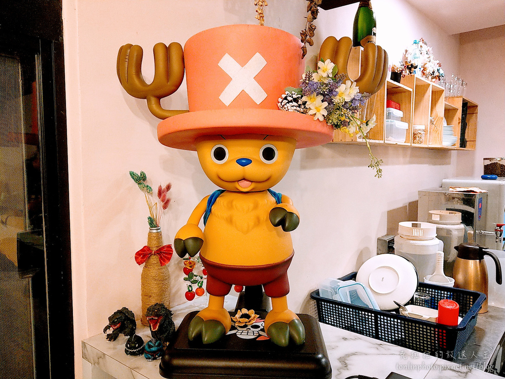 店家的用心在每一個小角落都可以感受到,甜點櫃的精緻、兔子杯墊架的逗趣、WIFI提示板的設計,甚至在一隅出現了與店內風格似乎不搭,卻又完美融合的海賊王喬巴公仔,我想喬巴粉紅帽子和頭上的乾燥花束肯定幫了不少忙。
