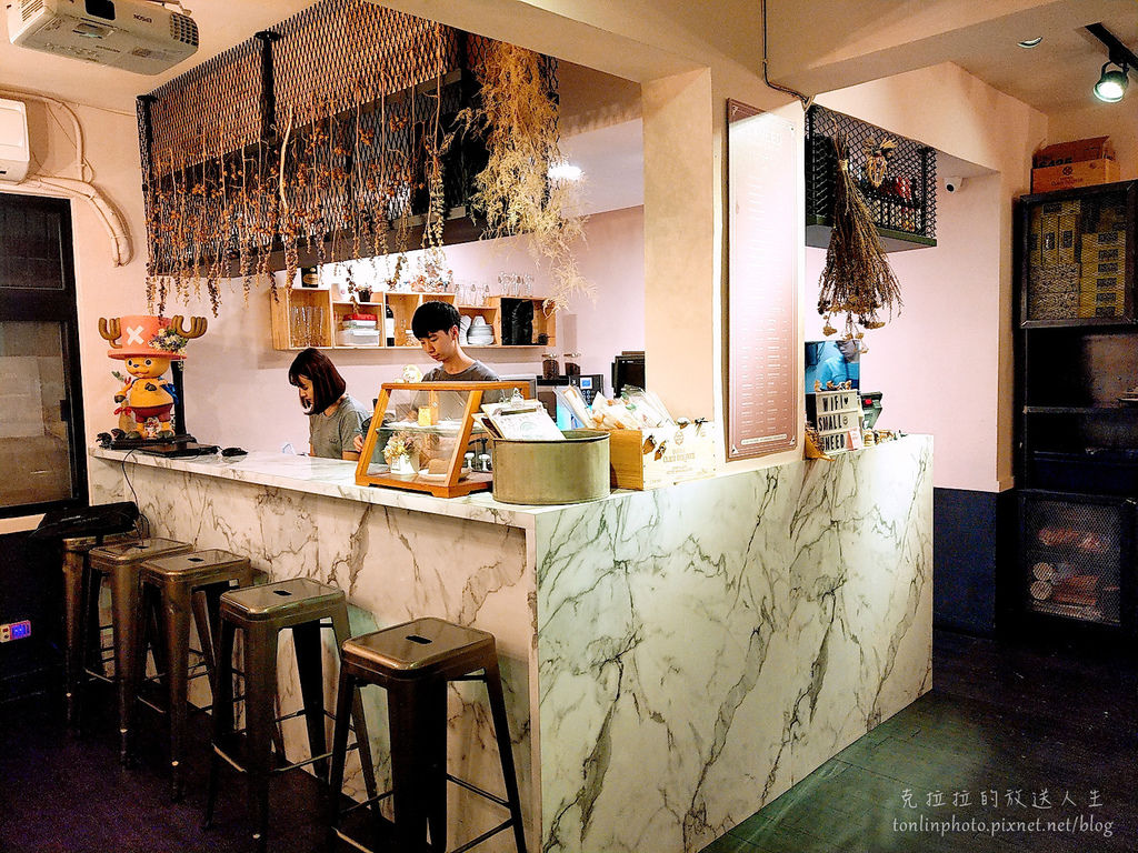 大理石砌成的吧台區,是店內視覺的焦點。典雅的大理石紋路,與粉紅色牆及頂上的乾燥花束互相交疊出了更迷人的氛圍。