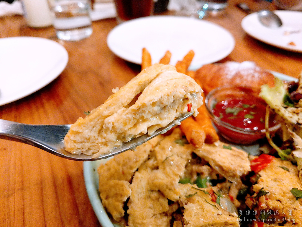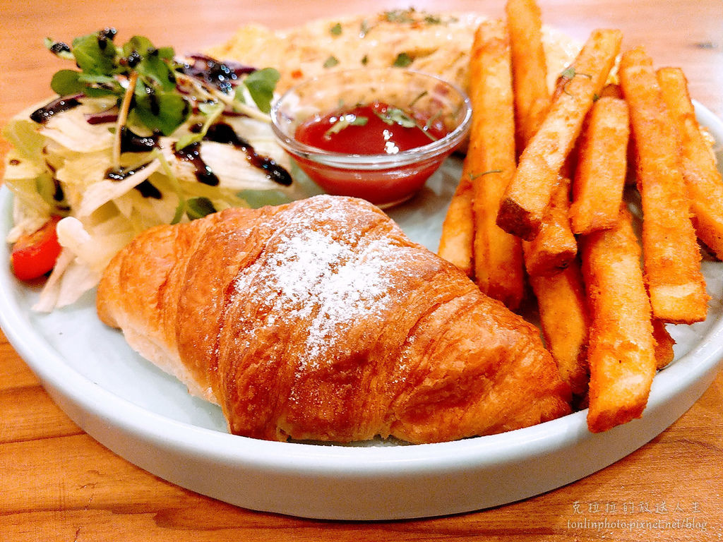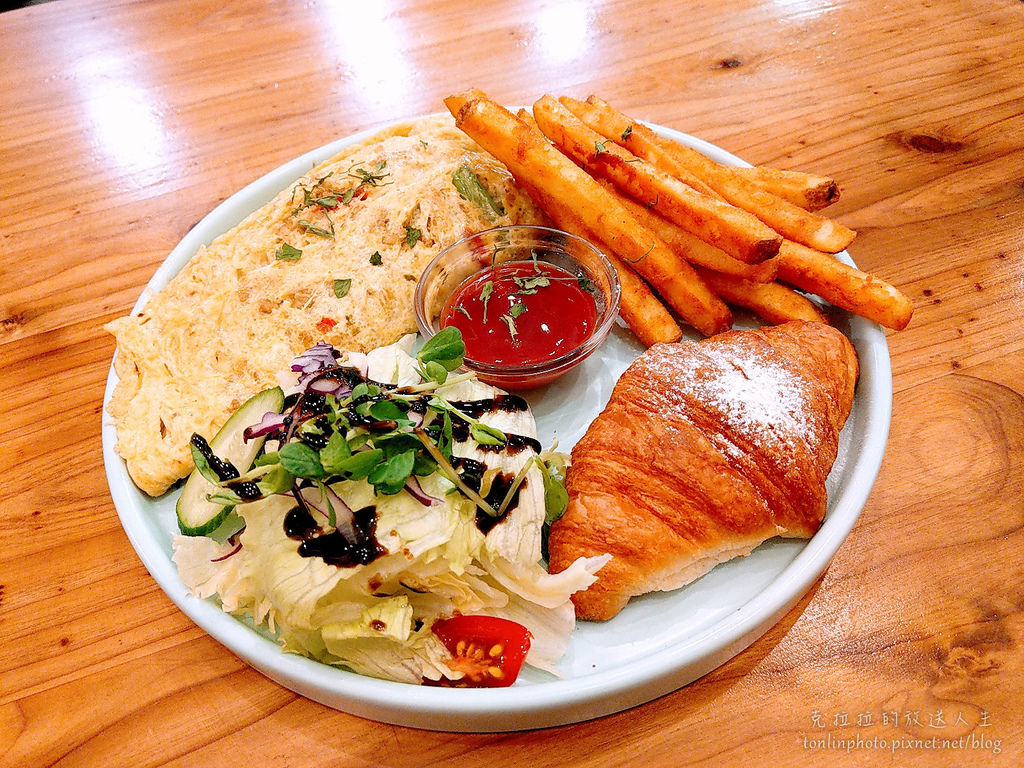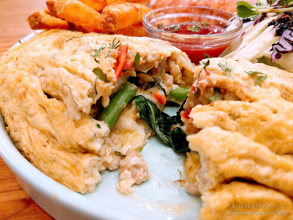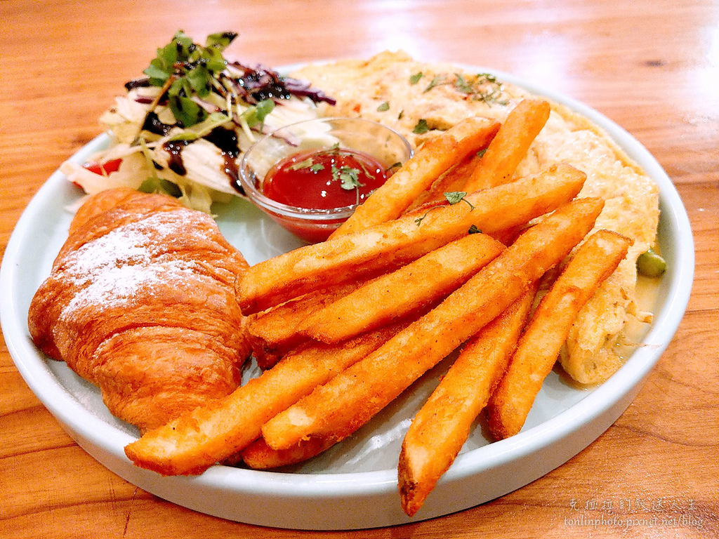 南洋老家打拋豬歐姆雷結合南洋風味與美式早午餐特色,這道餐點把微辣的打拋豬裹在軟嫩的歐姆雷中,蛋香與打拋豬的南洋香料香氣融合在一起。搭配清爽開胃的沙拉(油醋醬)、金黃酥脆的炸薯條,以及烤得香噴噴的小可頌,還搭配一杯飲品,吃完這一份早午餐完全飽足啊!