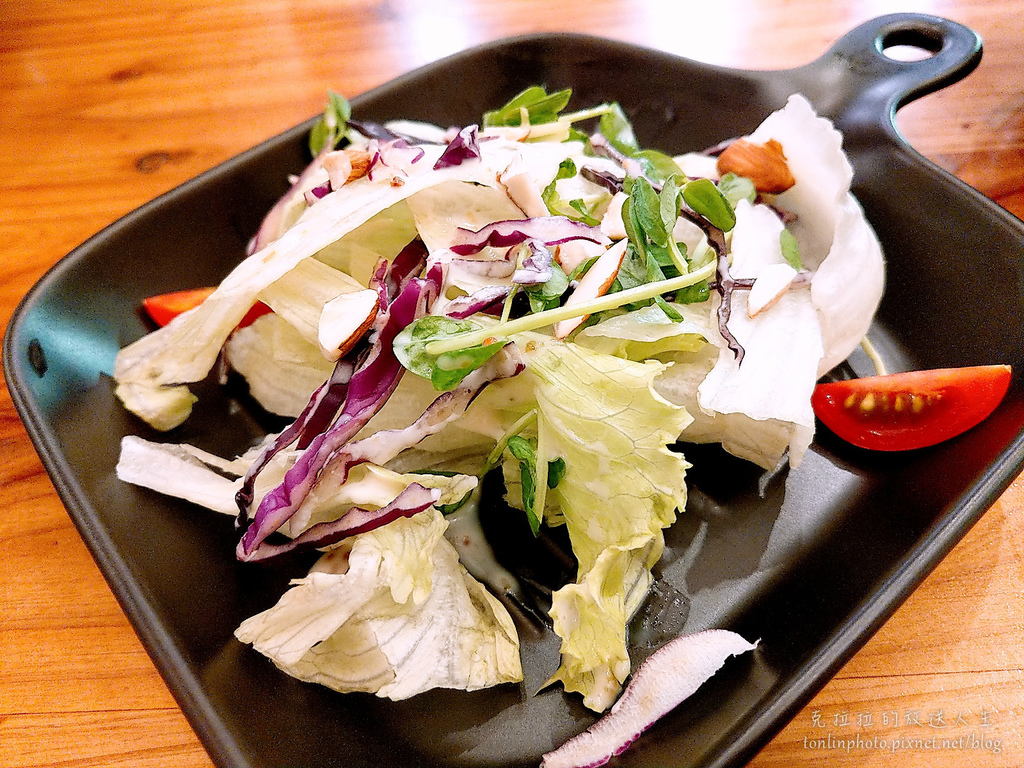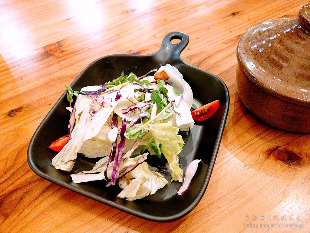 一起上桌的還有套餐的個人沙拉。U NEED 在餐具上也都很用心,用小鐵鍋盛裝的沙拉看起來特別可愛。