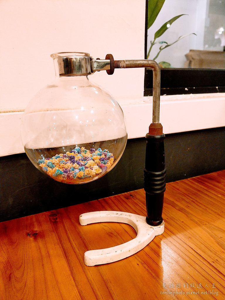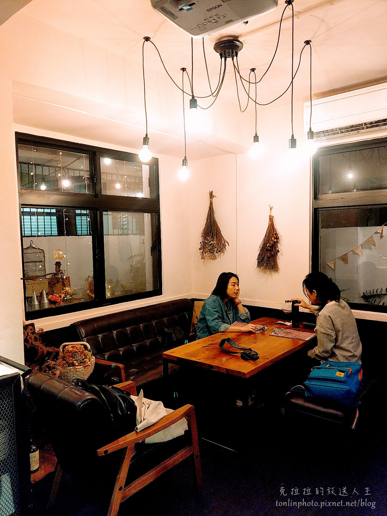 我們落座在吧台正對面的沙發區,在平日的夜晚裡奢侈地享受六人座的空間。沙發區除了有黑色皮沙發與原木長桌坐鎮外,還有吊掛型的設計燈飾和角落的古董燈座,以及桌上那一小盞讓人很難忽視的乾燥花燒杯加熱器陪我們一起浪漫。