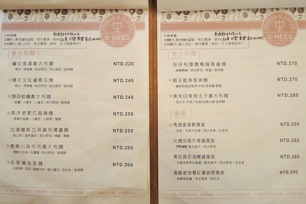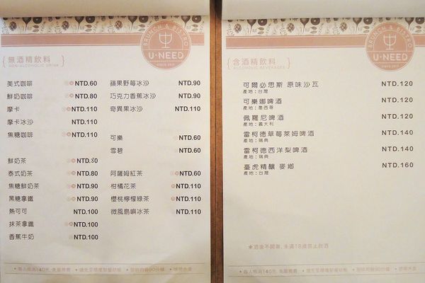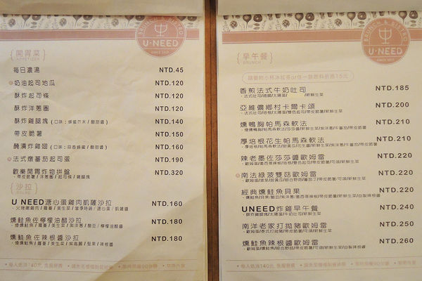 U NEED brunch&bistro 每人低消100元,免服務費
