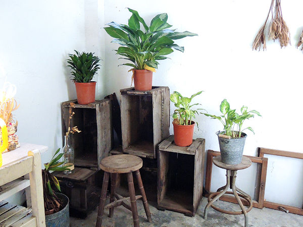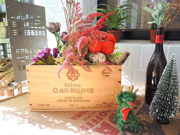 一桌上的木盒內擺放著各式各樣適合拍照打卡的花花草草