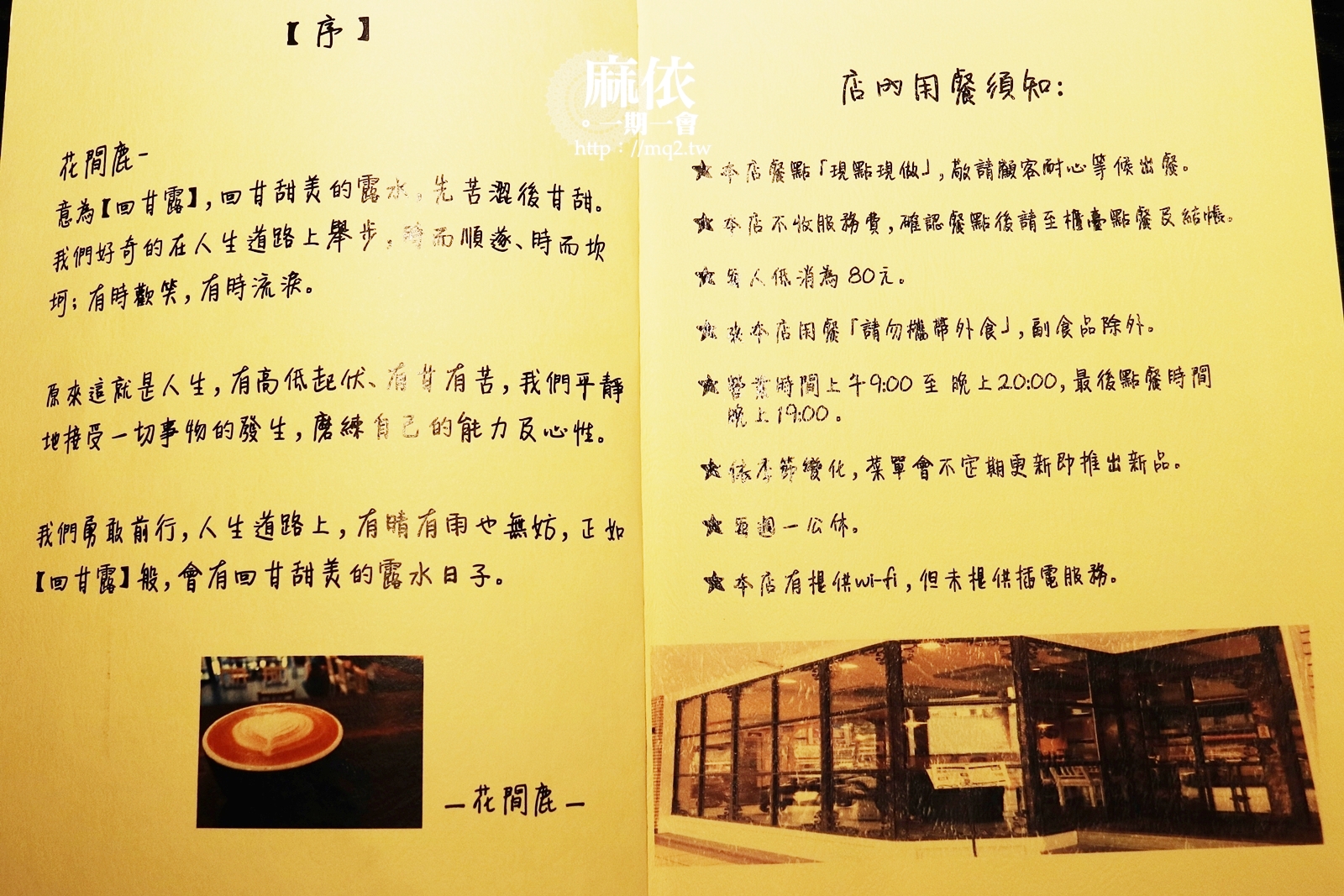 老闆夫婦不喜歡加入連鎖品牌被總公司拘束,偏愛自由自主,當初在思考店名的時候,是看到了這兩尊鹿,非常喜歡,加上很喜歡花草,搭配台語諧音而命名【花間鹿】,大家可以參考文末菜單的第一頁就有詳細的介紹喔!