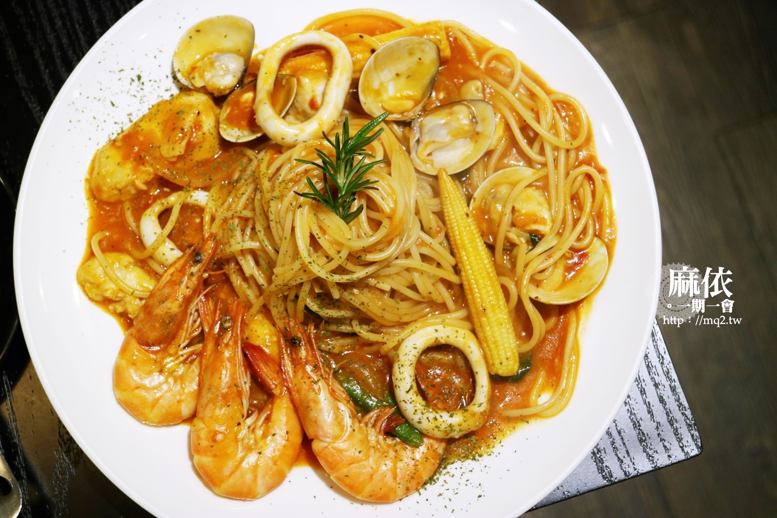 漁夫番茄義大利麵有很豐盛的海鮮、蝦子、蛤蠣、透抽、魚片。這盤義大利麵也被我們掃光,Good!