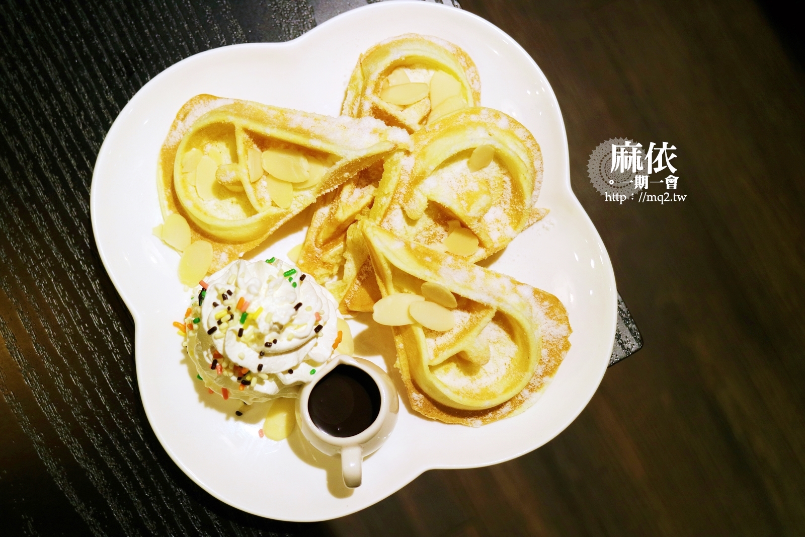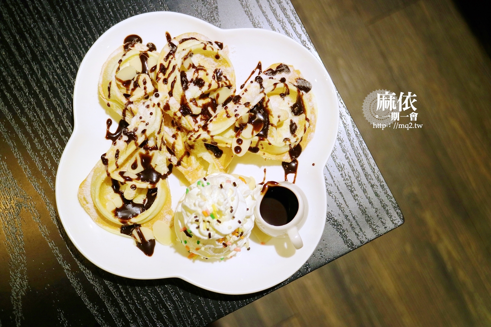 外脆內軟式的鬆餅是闆娘特調的比例,剛剛好也是麻依喜愛的口感,而每個口味都有大手筆的杏仁片;淋上巧克力醬後非常有賣相,闆娘強力推薦一定要沾奶油一起享用!