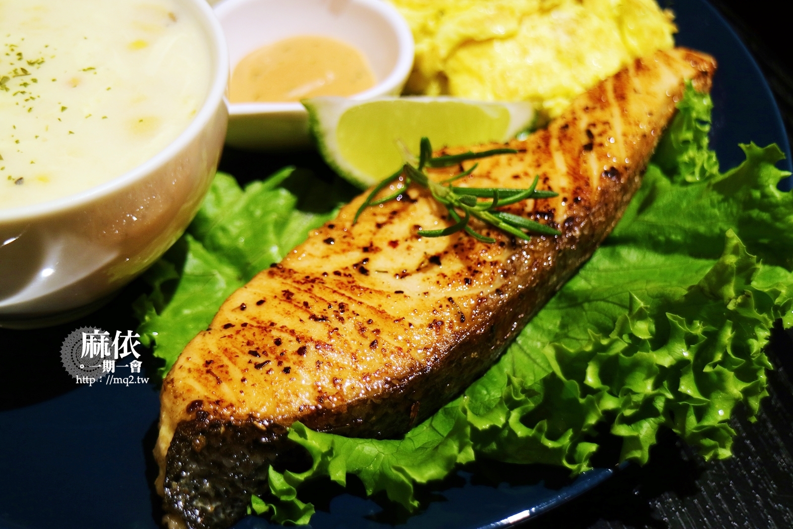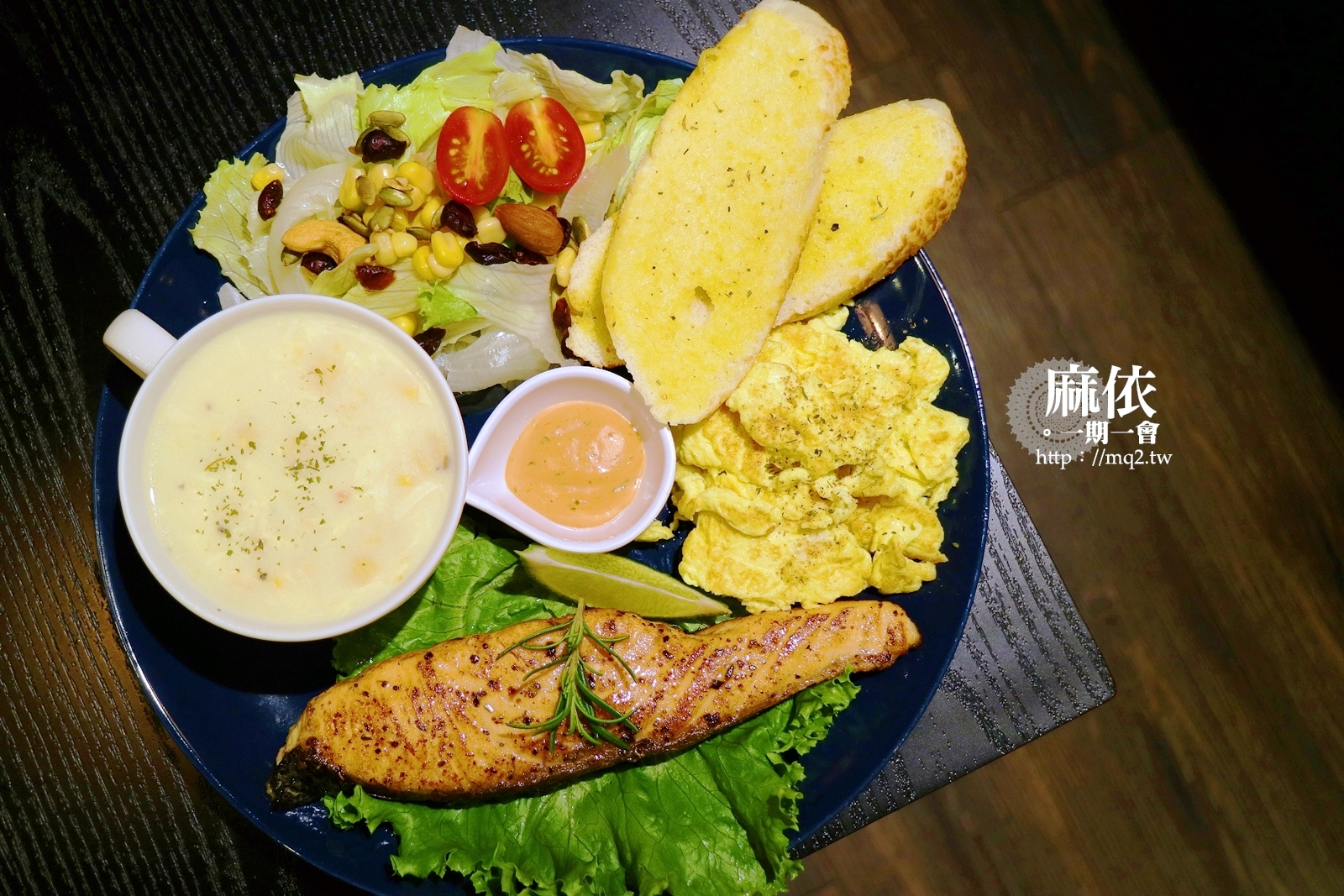 我們在菜單上看到這一套餐的名字,覺得實在太符合我們了,剛好我們也都超級愛吃鮭魚,決定order。由鮭魚、季節沙拉、炒蛋、起司軟法及湯品組成,一端上就驚呼「好豐盛喔!」