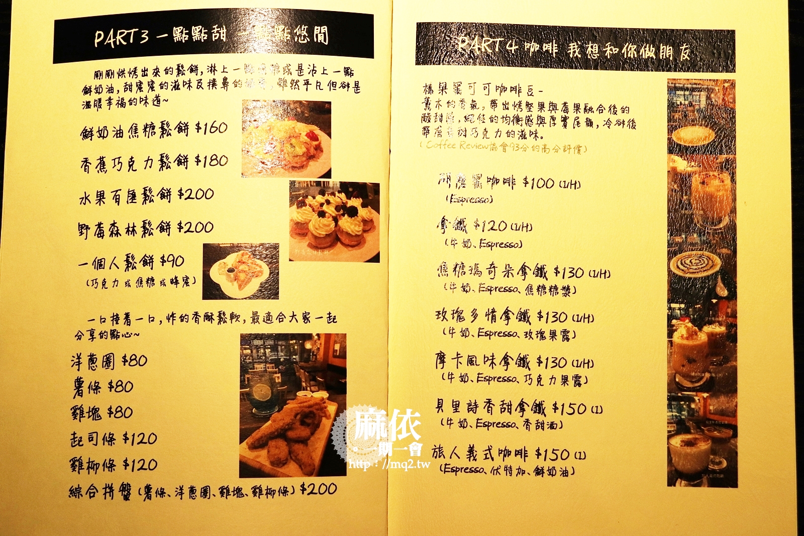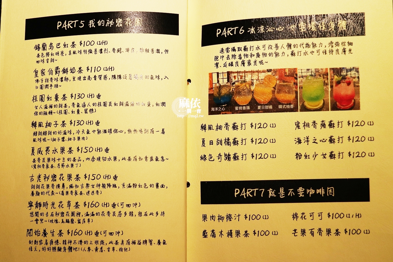 【花間鹿】的餐點有像Brunch式的套餐、也有義大利麵跟燉飯,如果不是想吃正餐,也有鬆餅、炸物、沙拉、墨西哥口袋餅;飲料也很多樣有咖啡、茶類、果汁跟蘇打可以選擇,也非常適合下午茶跟朋友聚會唷!