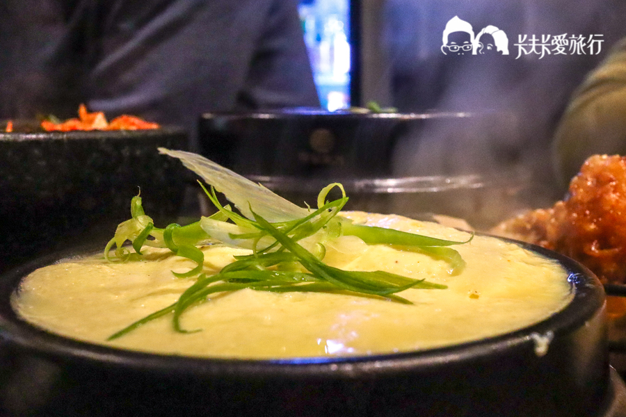 韓式蒸蛋外型比起一般台式或是日式茶碗真特別,是以直火烹調在蛋液7、8分熟時蓋上鍋蓋,靠著鍋裡的水蒸氣蒸出澎鬆的口感與膨脹的外型,一上桌就像煙囪般不斷地冒煙,是視覺與嗅覺的饗宴