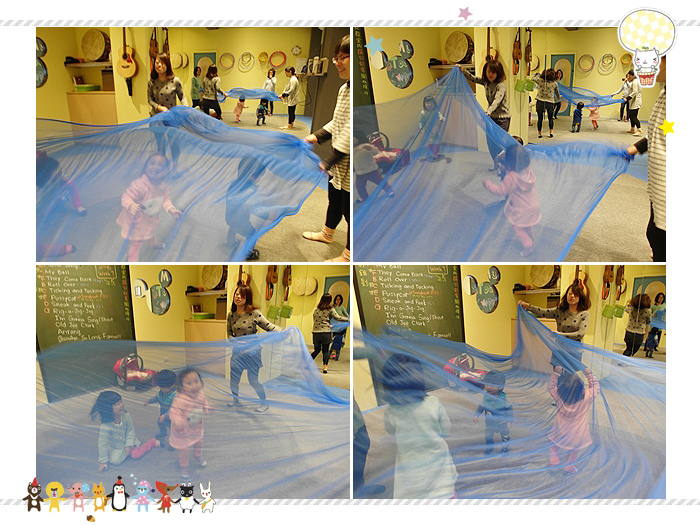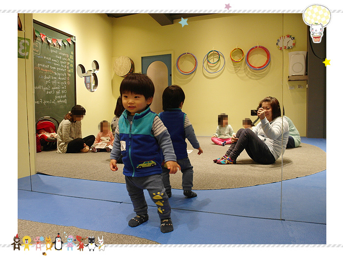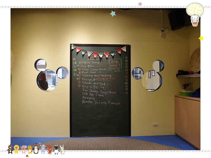 上課的內容會寫在黑板上,課堂上都是英文歌曲,然後使用道具來輔助,像球或是樂器等等