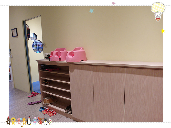 教室的門外頭有鞋櫃還有置物櫃提供擺放,還有小朋友的拖鞋及幫寶椅可以使用