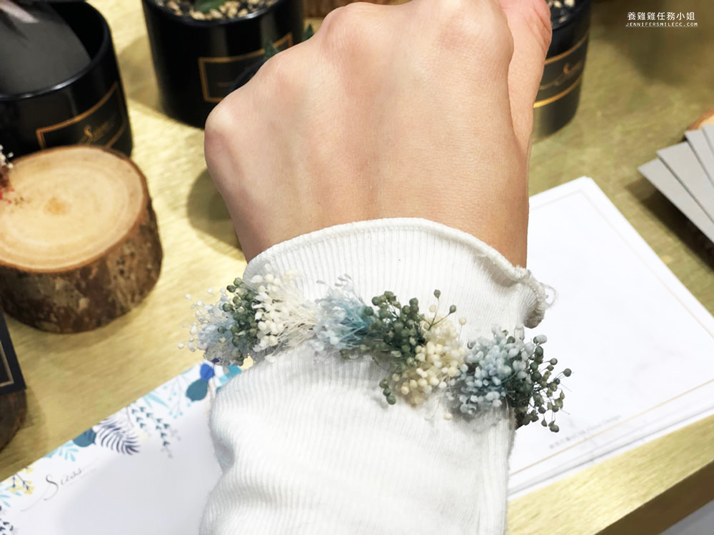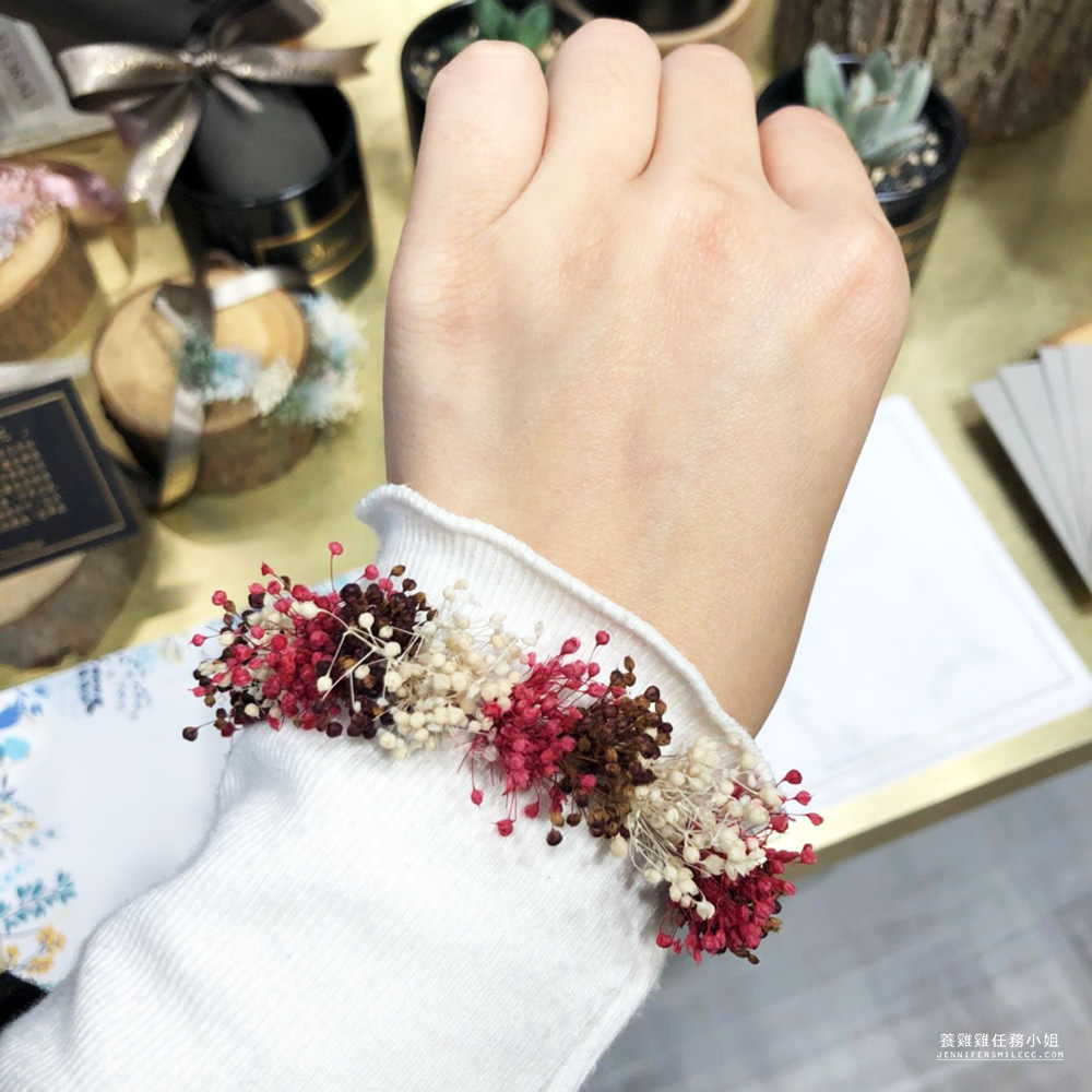 在敘思花藝信義店東看看西看看,店員介紹了我一款很漂亮的永生花手環。這款手環適合婚禮的 :lol: 不論是新娘或是伴娘都很好用,永生花細膩的綁在緞帶上,質感很好。