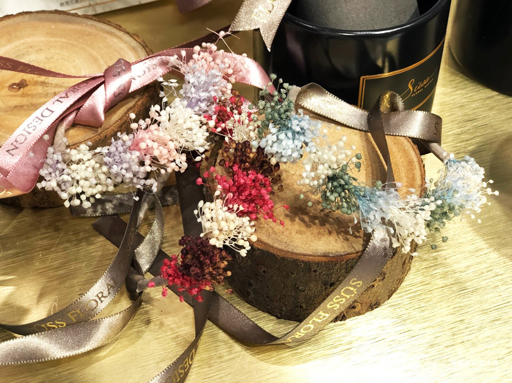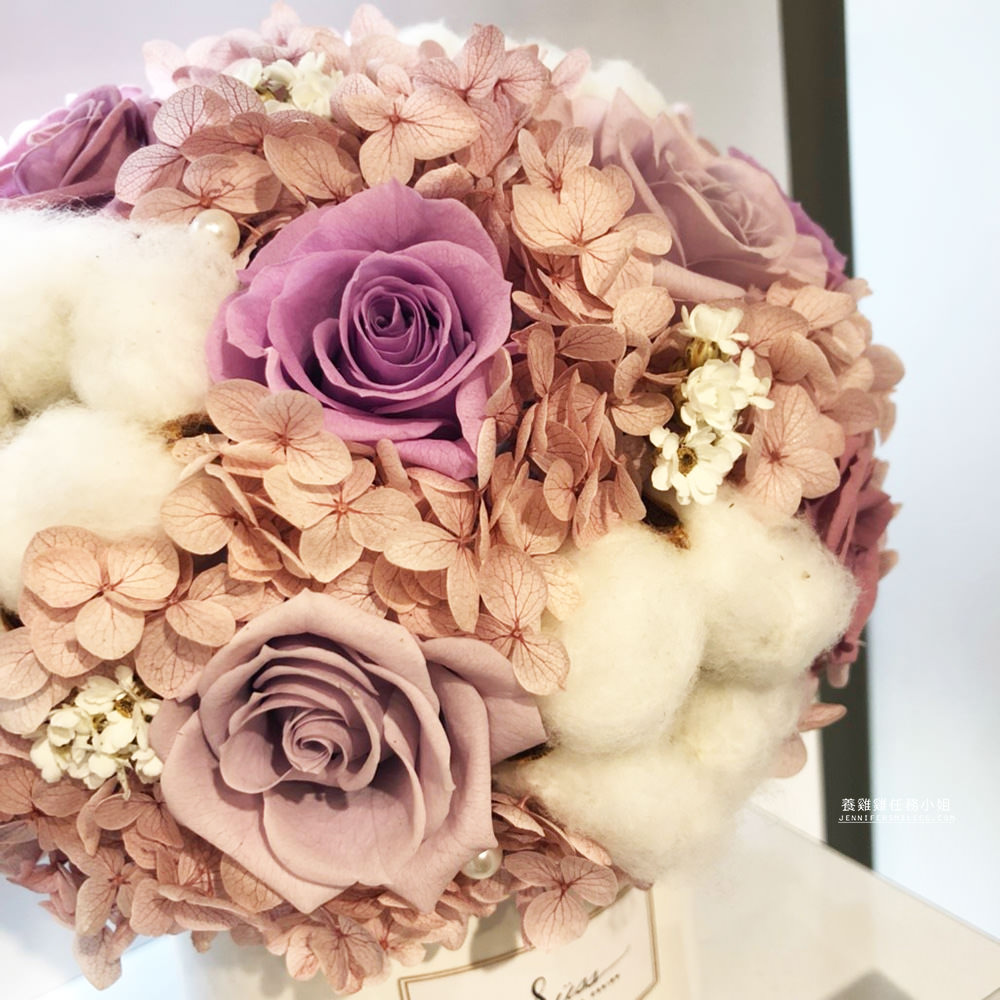 有漂亮婚禮用的手環,當然敘思花藝也有婚禮用的捧花。我嚮往這種永生花的捧花很久了,以後結婚真得特別的想要用這種樣式的捧花,除了很好看以外,還可以送給抽到捧花的朋友,或是自己留在家裡,也是一個加分的擺設。