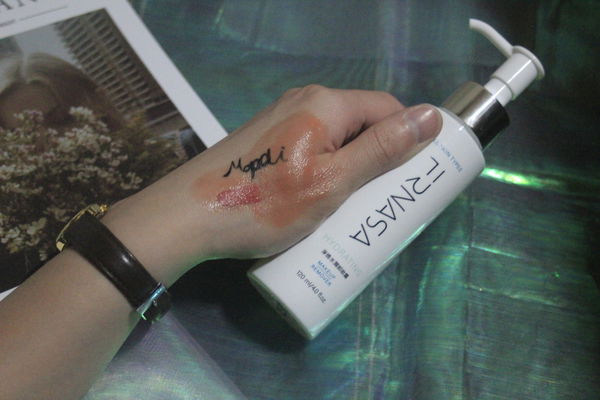 卸妝露為透明凝露質地,按壓出來後均勻按摩手部