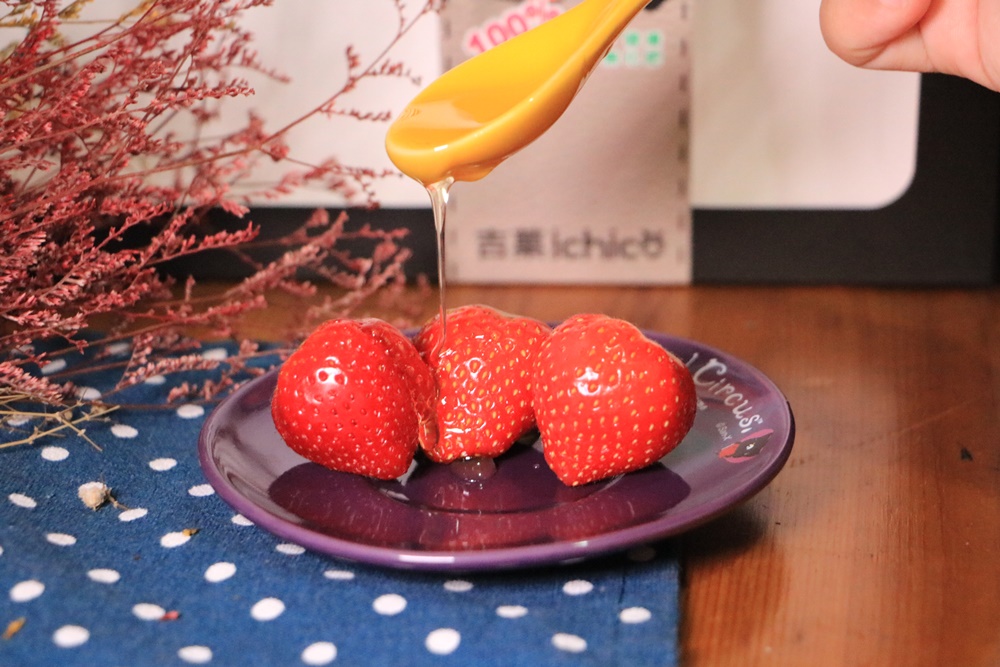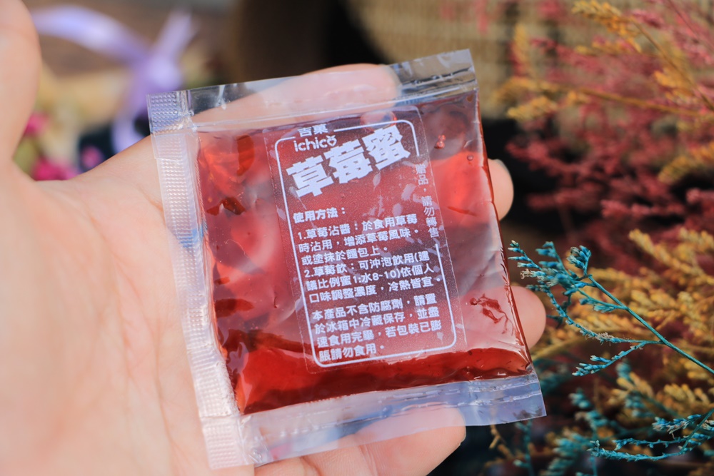 每一盒都附有草莓蜜,除了可以沾著吃,草莓蜜也可以泡茶喝。 建議比例 蜜1:水8~10,可依個人口味來調整濃淡度,冷熱皆宜喔。