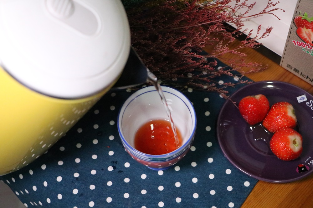 草莓蜜拿來泡茶喝,一口蜜茶、一口草莓,好幸福午茶時光啊。