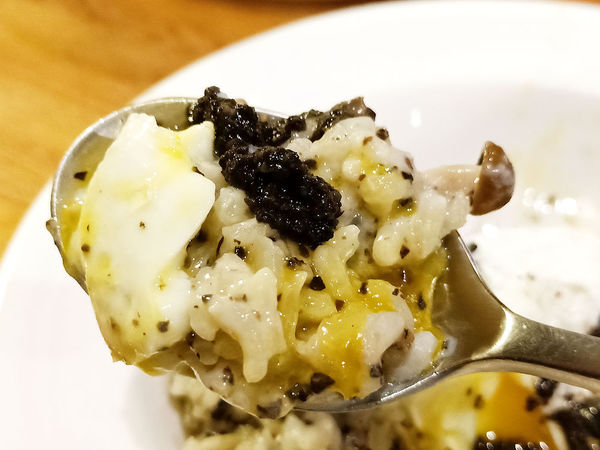 燉飯本身的濕潤度剛好一點也不糊爛,濃郁的松露香氣在與蛋液結合之後更顯得溫潤迷人,