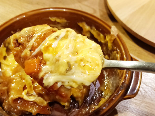 烤的金黃閃耀的起司不時散發誘人鹹香的奶香氣息,挖開後牽絲的模樣引發我的食慾~令人食指大動!!