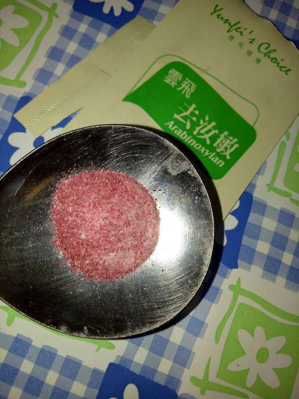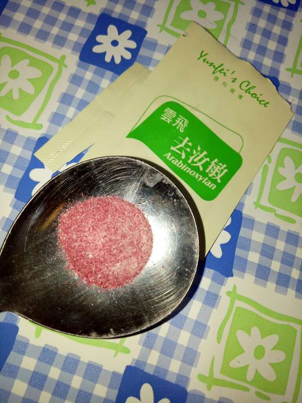 打開來裡面是粉狀的,而且是特別的紅色粉狀顆粒喔!!吃起來是清甜的味道!水若都會選擇在早餐後來一包!非常方便快速呢!吃起來沒有藥味!我還滿喜歡的!雲飛去汝敏為保健食品