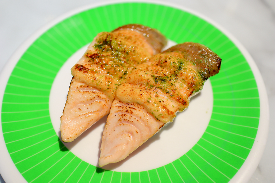 卡夫人最愛的全熟炙鮭魚,炙燒的質感讓鮭魚肉的表皮金黃焦脆,那焦脆的質感搭配著明太子,很對味