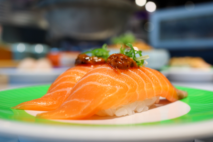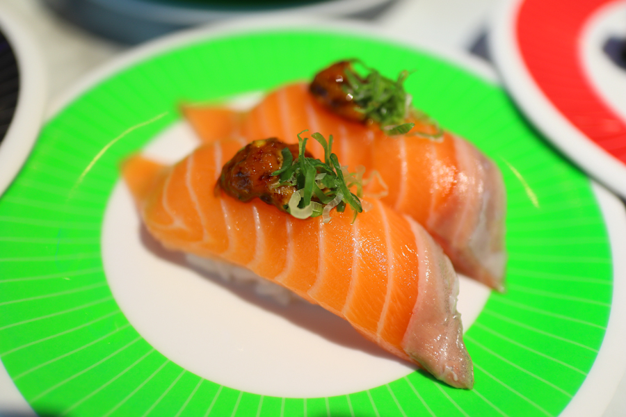 鮭魚握壽司是很暢銷的一款握壽司,外觀色澤滑嫩,紅橙橙的鮮美肉質,搭配上主廚創意的辛醬,辛醬味道有點類似五味醬,跟鮭魚非常搭